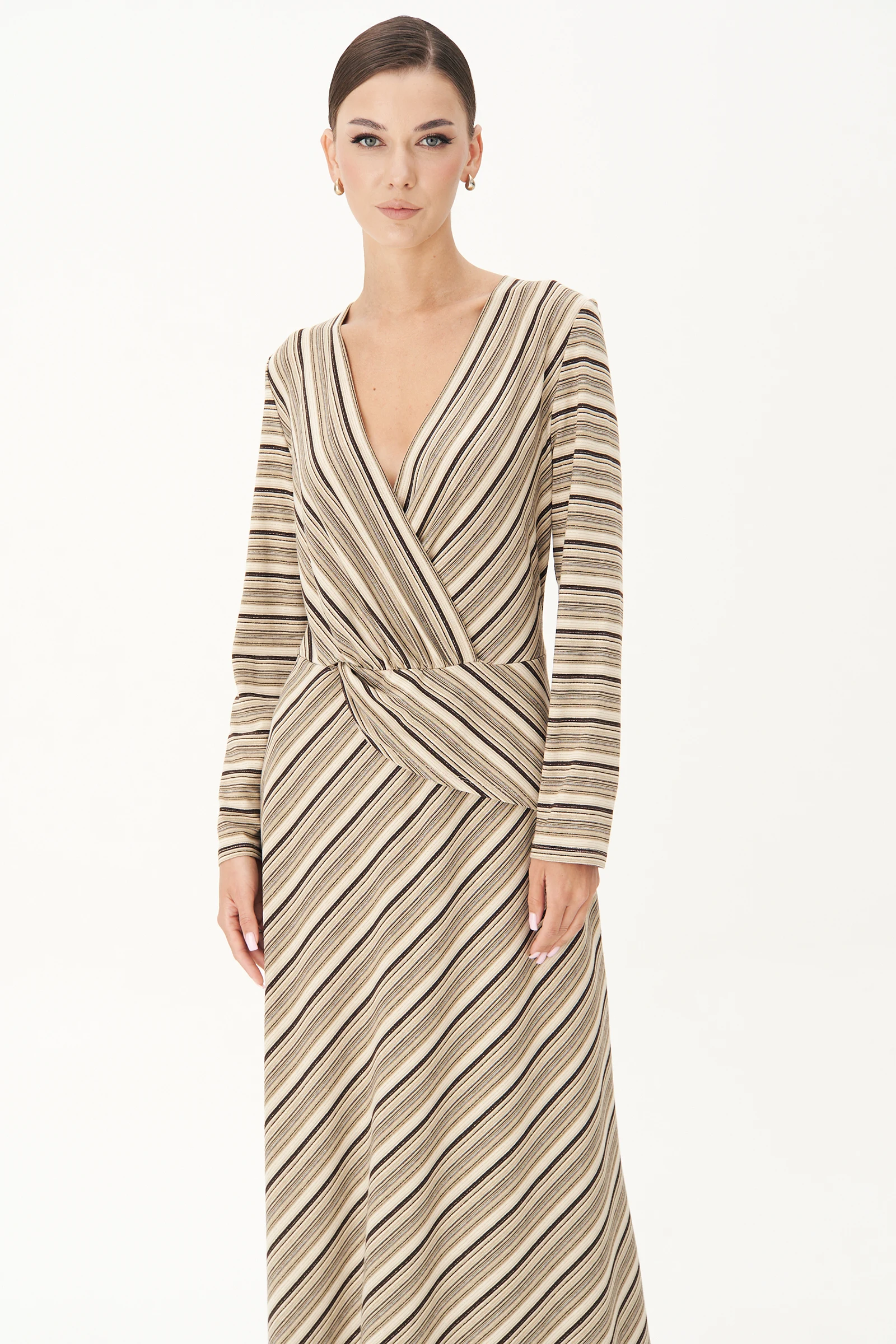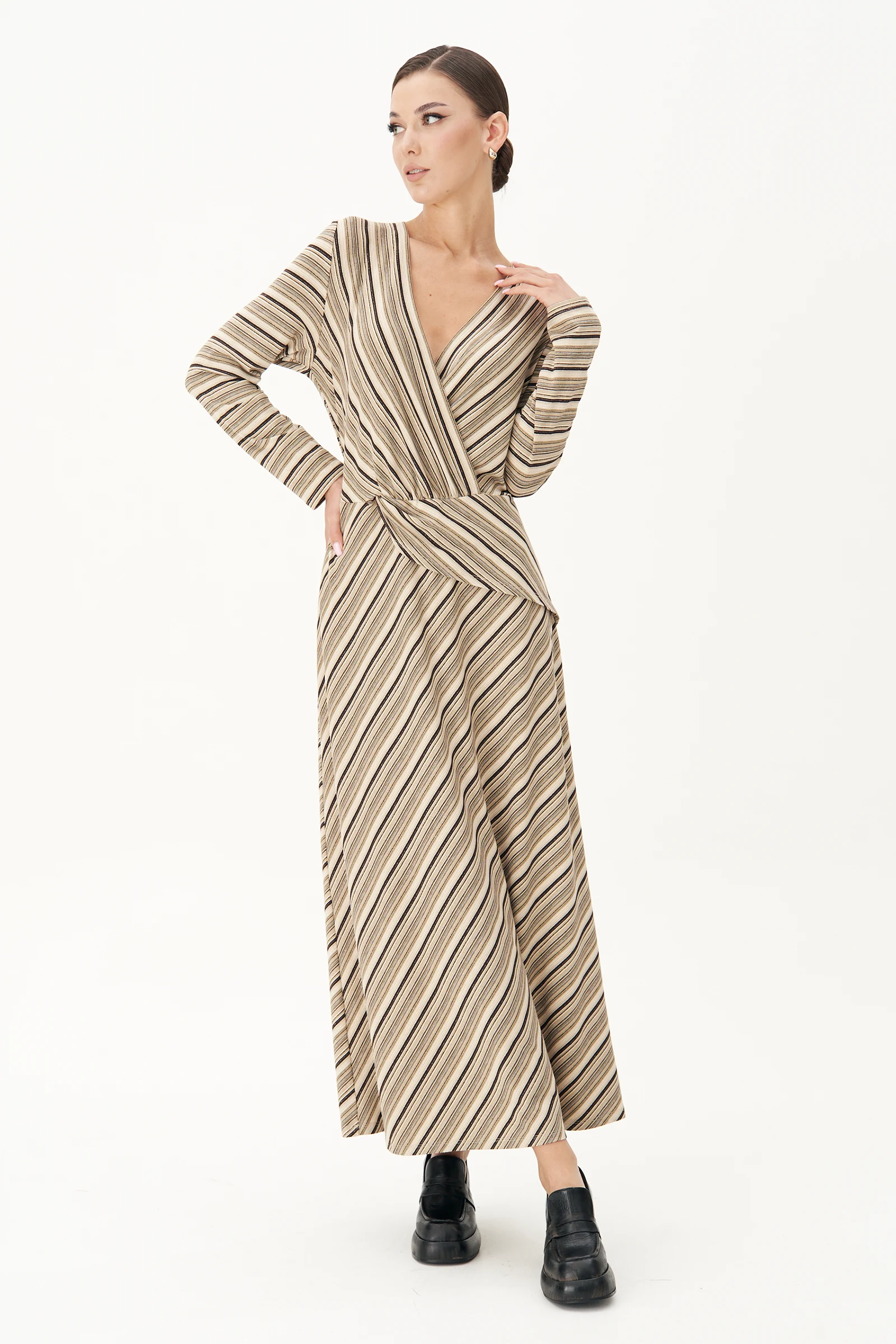 Модное платье - настоящее спасение для нерешительных. Не надо думать, что с чем сочетать, просто надевай его и выгляди не просто привлекательно, но и актуально.  Мега удобное трикотажное платье в актуальную полоску. Полуприлегающий силуэт, втачной покрой. Полочка с отрезным лифом, сложным запахом и отделочной деталью. Спинка с отрезным лифом. Юбка в диагональном направлении, что придаёт модели дополнительную пластичность.