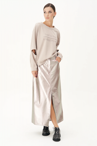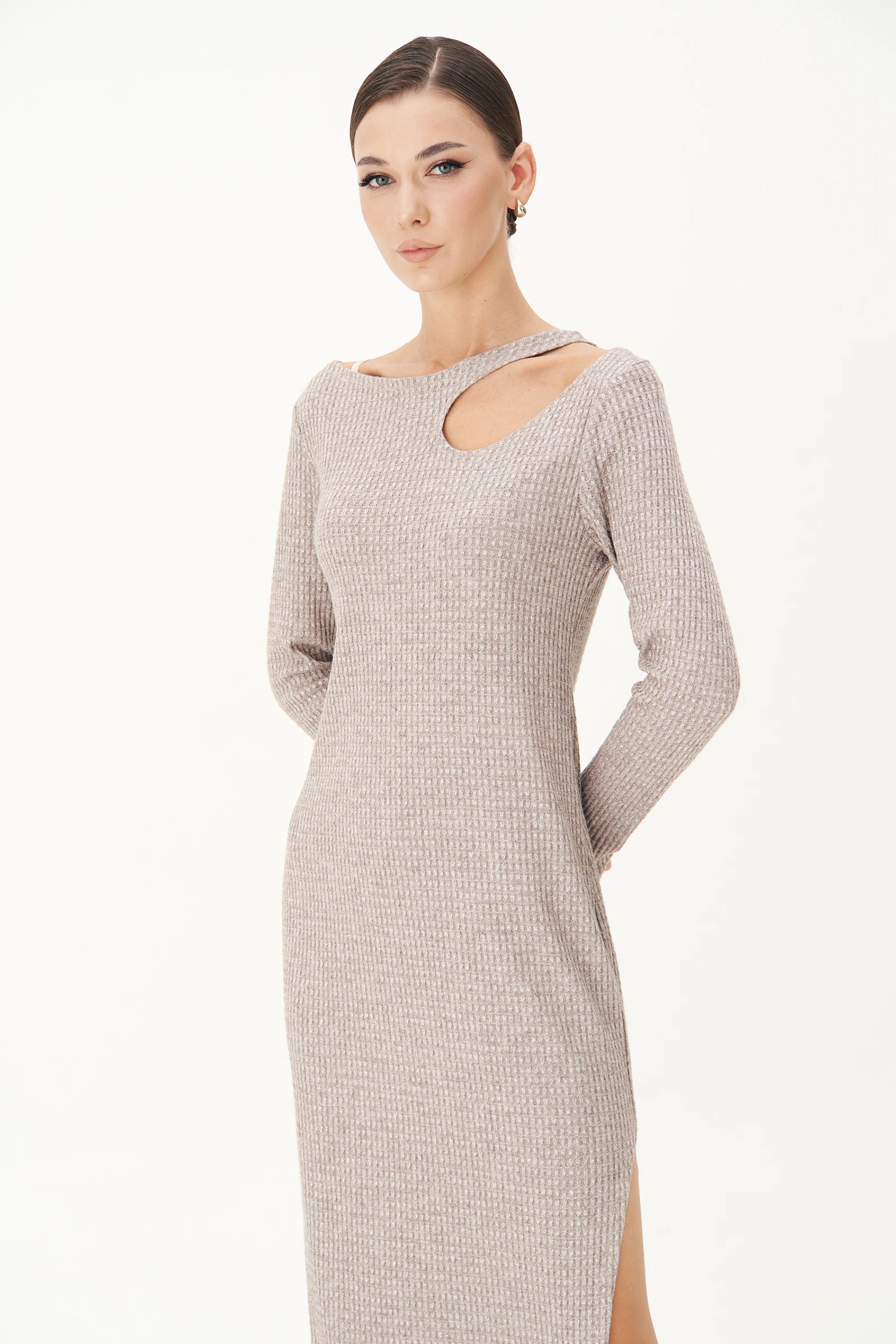 Нежное мерцание, рассыпанные по ткани искорки, не ослепляющие, а манящие словно далёкие созвездия.Невероятно комфортное трикотажное полотно с напылением, платье, на которое едва взглянув, сразу хочется надеть.Прилегающий силуэт, втачной покрой, интригующая капля в области декольте, эффектный разрез по боковому шву.Длина платья около 132 см.Длина рукава около 62 см.