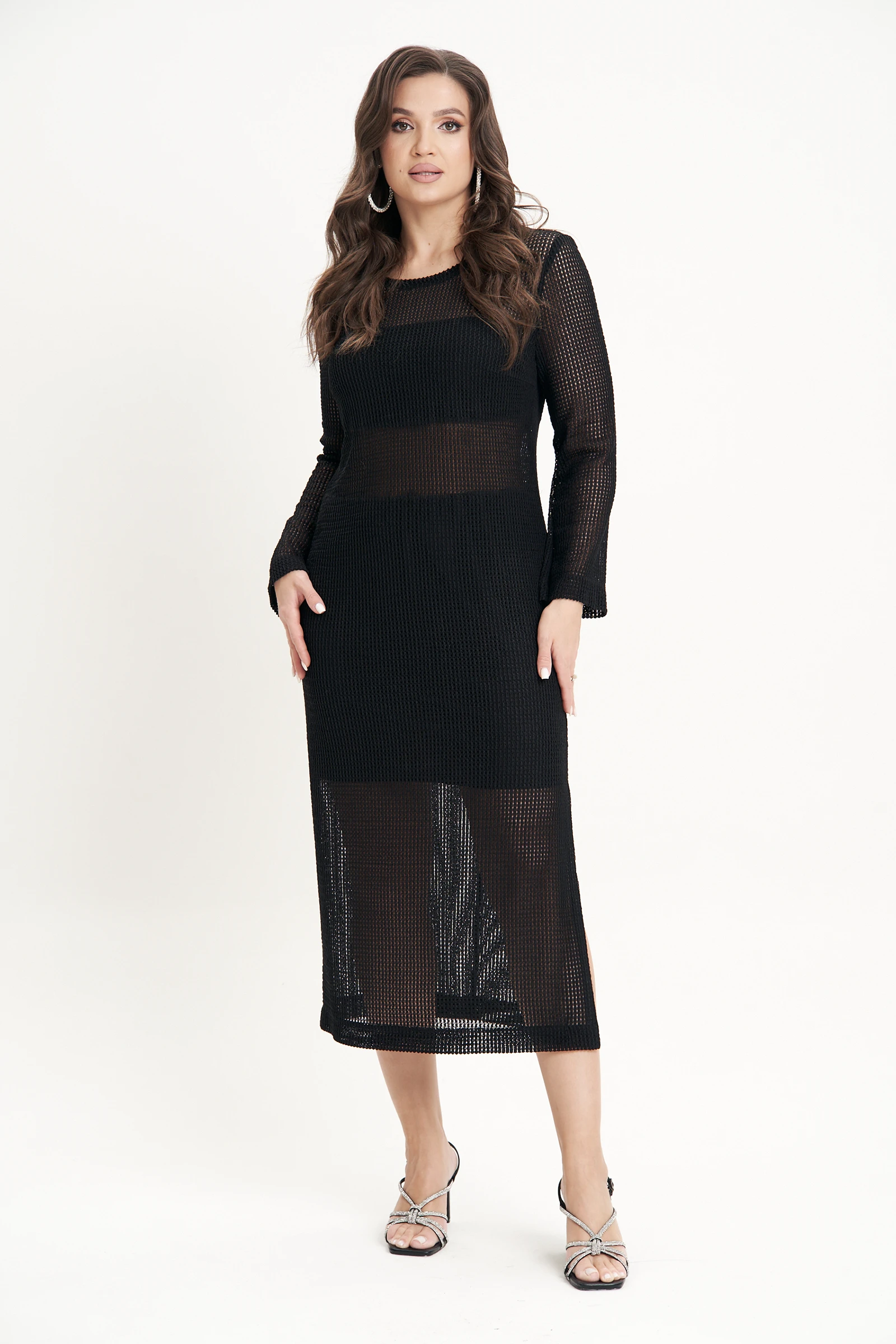 Выполнено из трикотажной фактурной сетки с металлическим напылением - такое платье станет отличной альтернативой вязанным и кружевным нарядам - лёгкое, струящееся, соблазнительное.