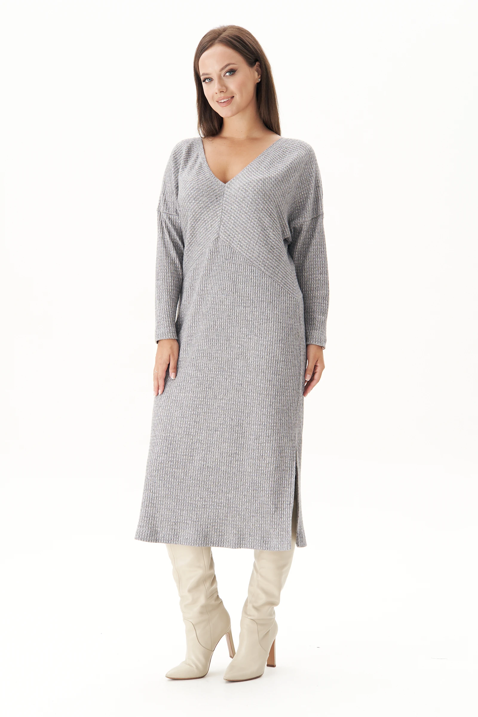 Трикотажное платье - главный хит осени 2024.Этот универсальный вариант одежды подходит для любых ситуаций, под любой стиль и под любую погоду. Невероятно комфортное трикотажное полотно с мерцающим эффектом, создаваемое небольшим вкраплением люрексовой нити.Свободный полуприлегающий силуэт частично с цельнокроенным рукавом, геометрическим подрезом и эффектным разрезом.V -образный вырез горловины.Полочка с отрезной верхней частью, эффектно подчёркнутой изменяющим направление петельного ряда и центральным швом. Нижняя часть полочки цельная. Спинка, как бы повторяет полочку. Рукав зауженный к низу.Длина платья около 110 см.Длина рукава с плечом около 74 см.