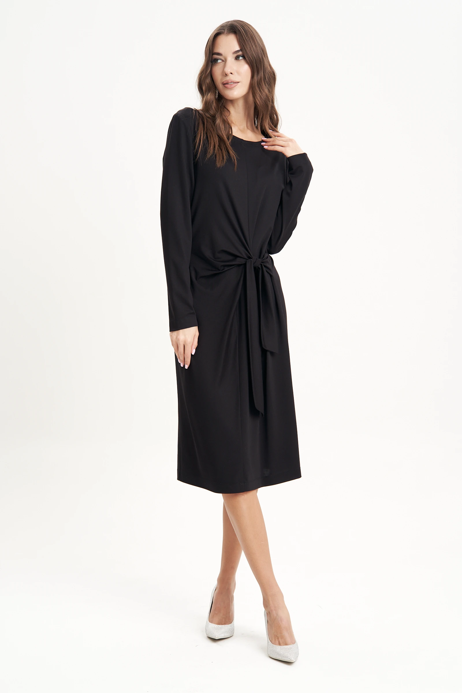 Платье полуприлегающего силуэта, втачного покроя с круглым вырезом горловины и длинным рукавом. Комфортное вискозное полотно, средняя длина. Полочка с центральным швом и ассиметричным поясом-завязкой, образующим драпировку на правой половине. Рукав одношовный.