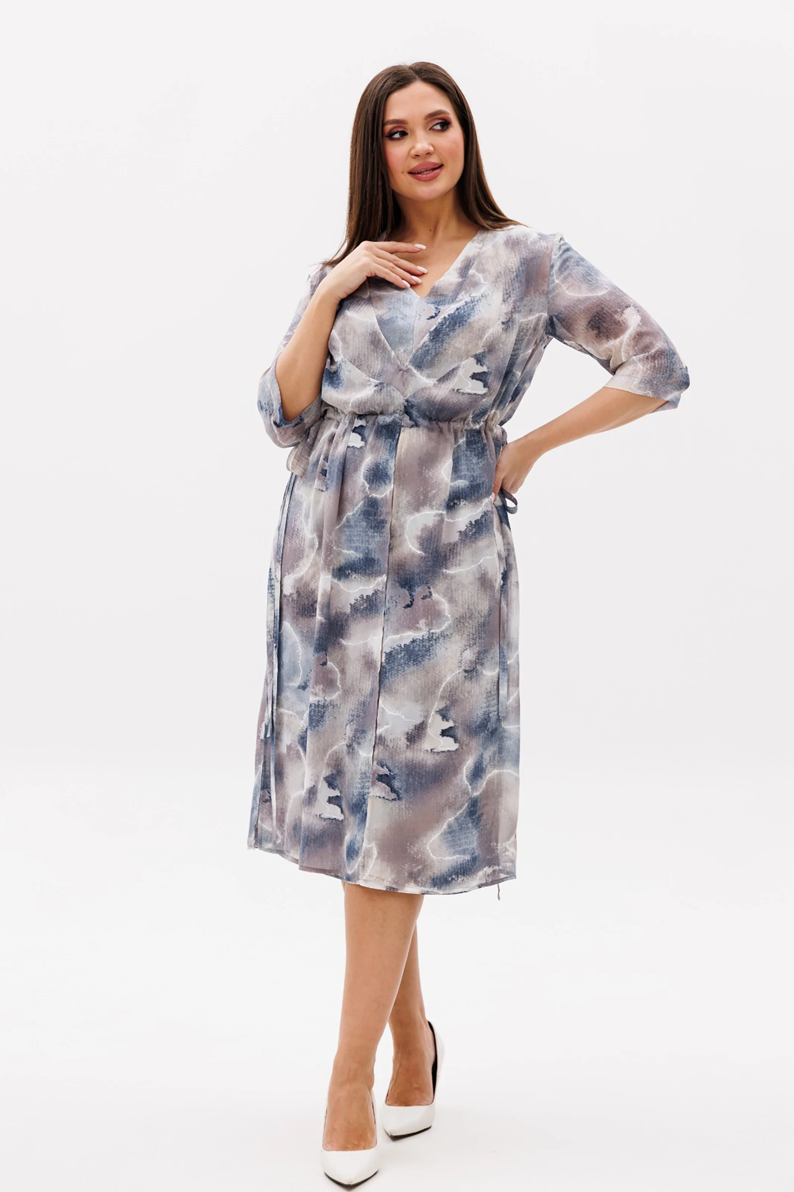 Верхнее платье А-силуэта, отрезное по линии талии на полочке, с мягкой складкой и эффектными разрезами по центру переда и боковым швам. Рукав втачной, на притачной манжете со сборкой в нижней части.
