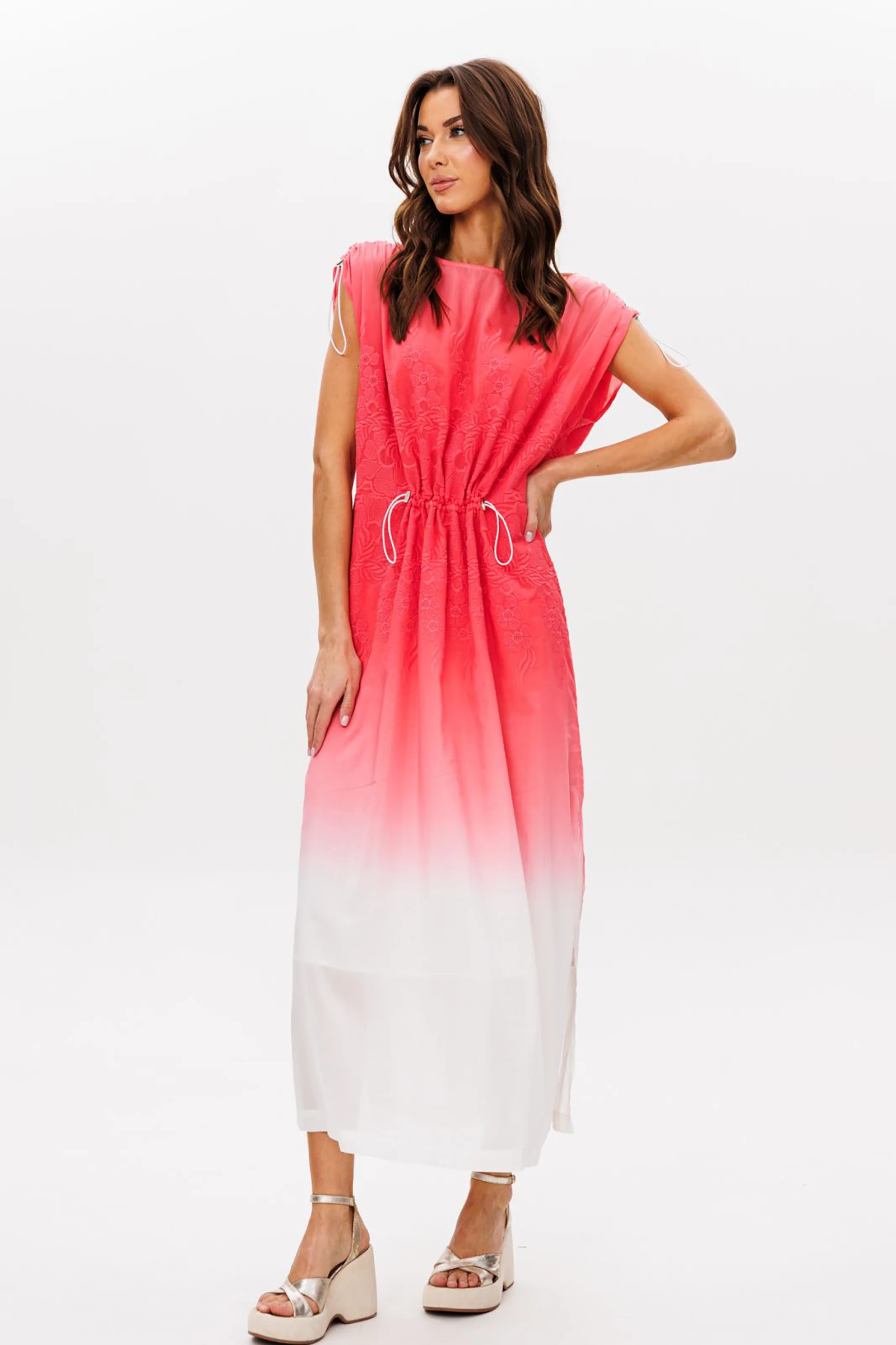 Солнце, жара, вы и ваше идеальное летнее платье. Нежное, лёгкое оно должно быть в вашем гардеробе не только для настроения, но и для самоощущения. Длинное платье в пол - это настоящий лета.Правильный крой украшает любую фигуру, дарит настроение легкости и свежести. Свободный упрямлённый А-силуэт, цельнокроеный покрой, эффектные подтяжки на эластичный шнур и фиксаторы по плеча, и частично по линии талии на полочке и спинке.Длина изделия около 95 см. Длина рукава с плечом около 30 см.