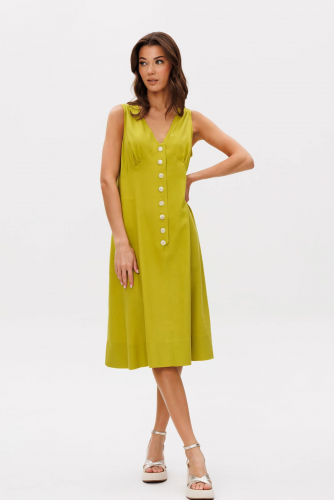 Платье из комфортного вискозного полотна, А-образного силуэта, без рукава, с эффектными отлетными деталями. Полочка с отрезным лифом с вытачкой, изящной драпировкой-поясом, и отлетными деталями на юбке. Спинка отрезная по линии талии, с частичной эластичной кулисой по центру спинки.