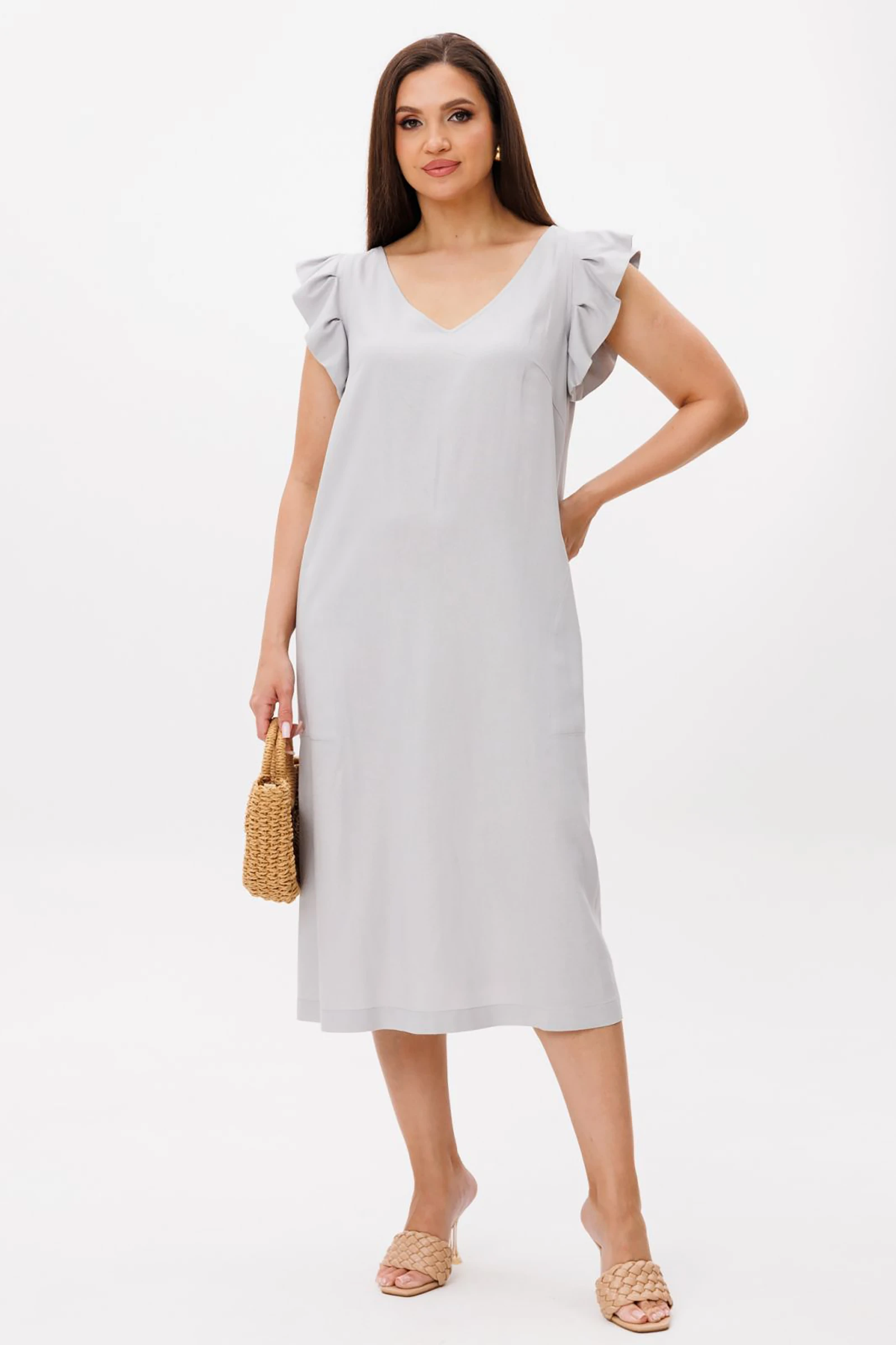 Свободный А-силуэт, изящный V-образный вырез, романтичное крылышко, комфортная длина миди. Полочка с нагрудной вытачкой и карманом в боковом шве. Спинка со средним швом, вырезом каре и эффектной завязкой, удерживающей линию горловины.