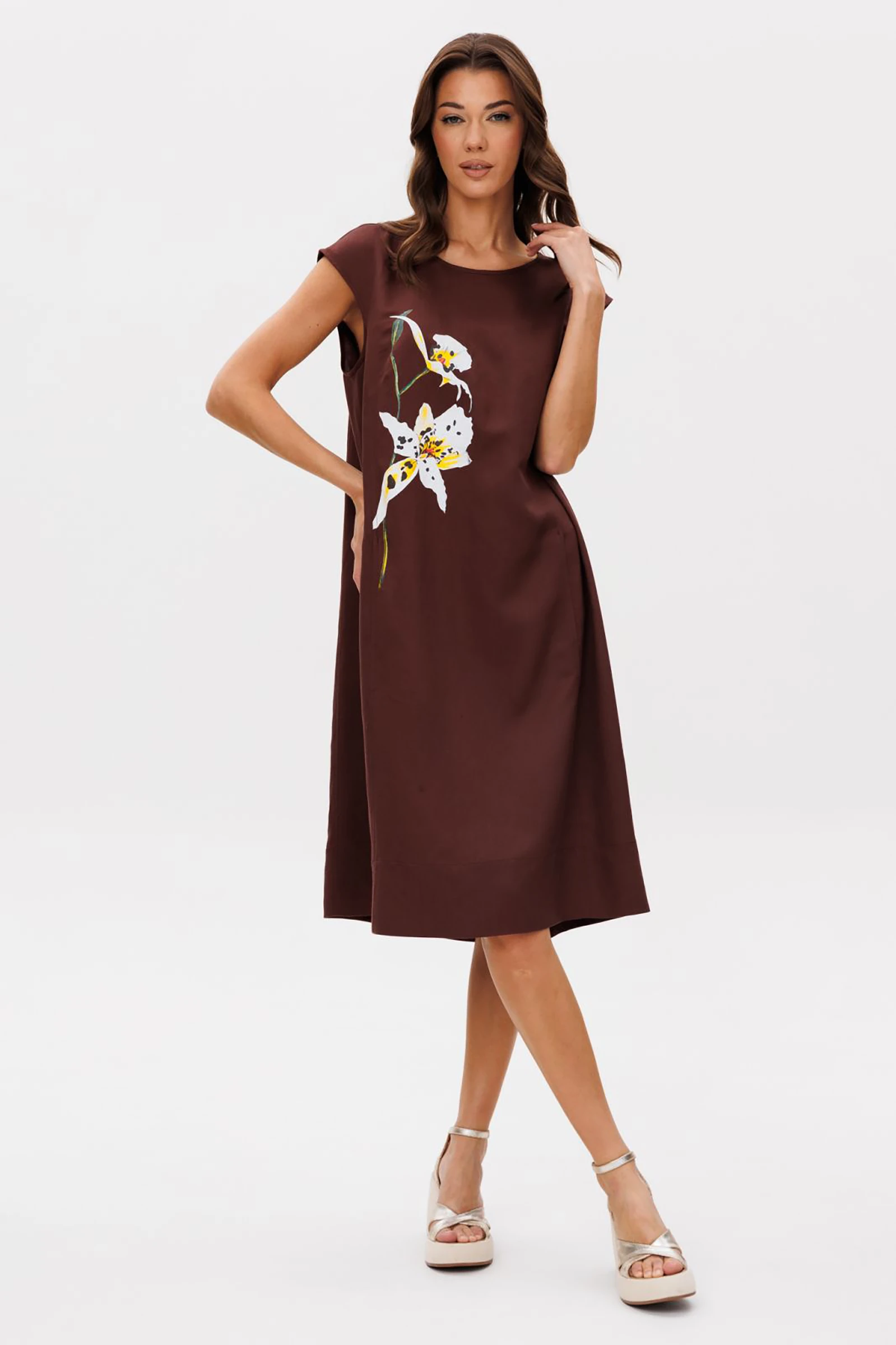 Простой А-образный крой, который подходит практически всем, слегка заниженная линия плеча и эффектный авторский принт, придающий особый шарм платью. Минимализм и роскошь,-все в одном изделии. Полочка с вертикальными рельефами и карманами в них. Спинка с центральным швом, вертикальными рельефами и застежкой каплей.