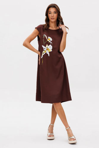 Свободный А-силуэт, втачной покрой. Полочка с ценральным швом и диагональными кулисами с завязками. Рукав со сборкой по линии низа. Спинка с отрезной кокеткой. Нижняя часть спинки со сборкой по центру. По низу платья притачной волан со сборкой. Подкладка платья из х/б батиста, на регулируемых бретелях, с притачным воланом с кружевом.