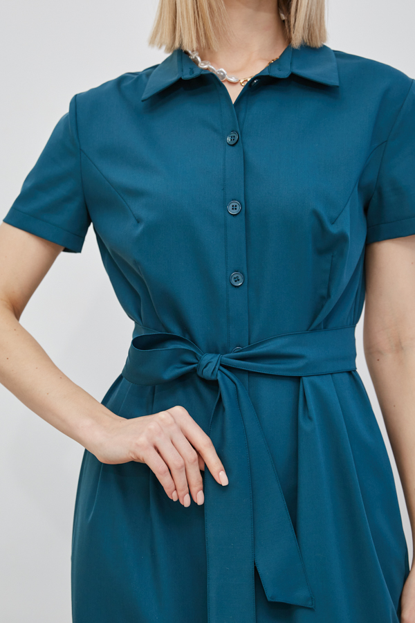 Платье приталенного силуэта из вискозной плательной ткани. Изделие отрезное по линии талии с защипами. В боковых швах карманы. Втачной короткий рукав. Притачная планка с застёжкой на пуговицы. Вырез горловины обработан отложным воротником на стойке. В комплекте пояс из основной ткани.