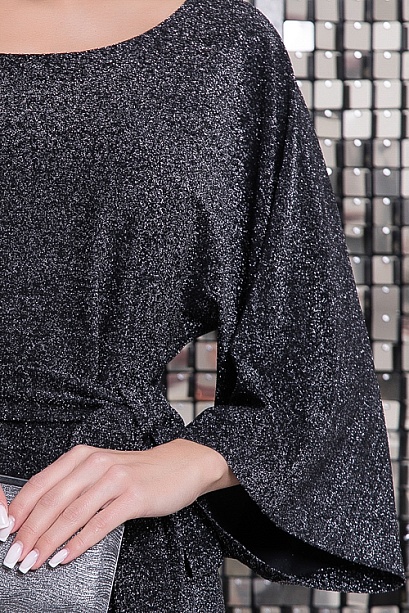Платье из трикотажного полотна  с люрексом свободного силуэта,отрезное по лини талии.Лиф платья с эффектными цельнокроеными рукавами.Пояс из основной ткани в комплекте.