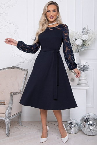 Нарядное платье из трикотажного полотна ,отрезное по линии талии с расклешенной юбкой.Втачные рукава и кокетки по переду и спинки лифа из эластичного кружева.Пояс из основной ткани в комплекте.