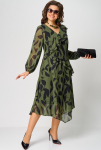 Платье женское нарядно-повседневное выполнено из крепа в сочетании с кружевом и отделкой из крепа с люрексом. Вырез горловины воротник на стойке рубашечного типа, рукав втачной 7/8 по низу на притачной манжете из отделочной ткани по полочке нагрудные вытачки. По низу двойной волан собран на сборку. Застежка потаная с планкой из отделочной ткани до волана. Декором служит дизайн отделочной ткани и кружева.