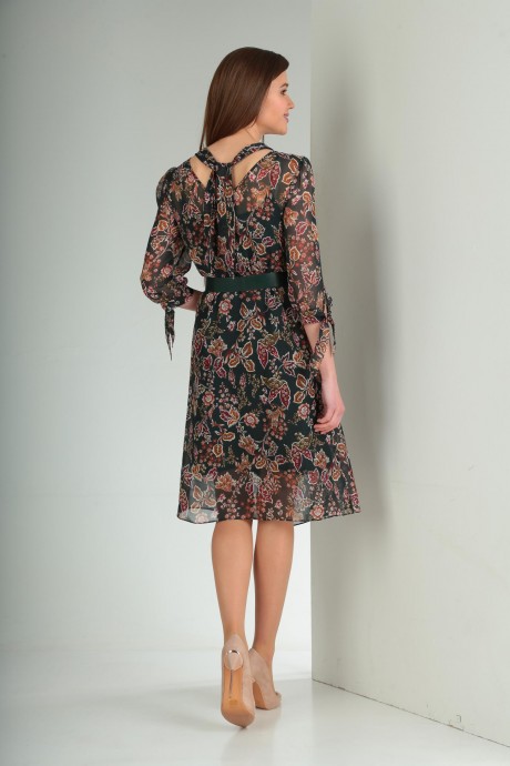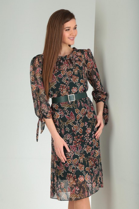 Платье женское состоит из нижнего платья на бретелях(из трикотажного полотна) и верхнего свободного кроя(из плательно-блузочной ткани). По переду верхнее платье: нагрудная вытачка перенесена в сборку по горловине. Горловина - воротник-хомут, переходящий в завязки по спинке; по переду округлой формы, по спинке V-образной. Рукав втачной одношовный, со сборкой внизу, на манжете с завязками. В комплект входит съёмный пояс. В этом платье вам обеспечен безупречный вид на работе, элегантный и романтичный образ абсолютно в любой обстановке! полиэстер 100%