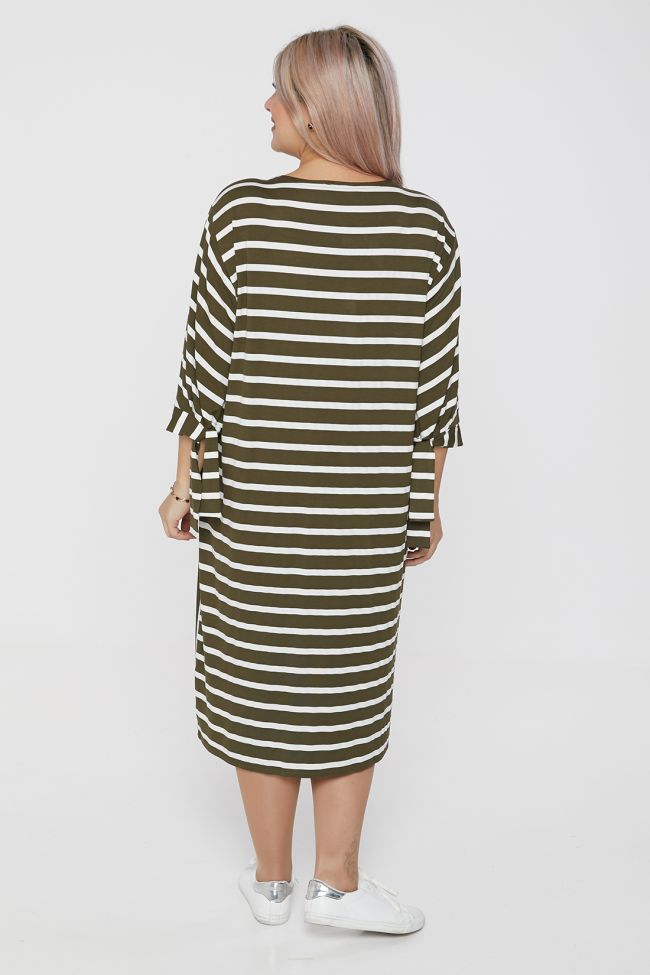 зеленый Платье прямого силуэта из трикотажного полотна. Круглый вырез горловины обработан на спецмашине. По переду вертикальные рельефы и удобные накладные карманы. Спинка цельнокроеная.  Линия плеча приспущенная, рукава длиной за локоть, по низу оформлены манжетами переходящими в завязки. Низ разноуровневый, обработан на спецмашине.