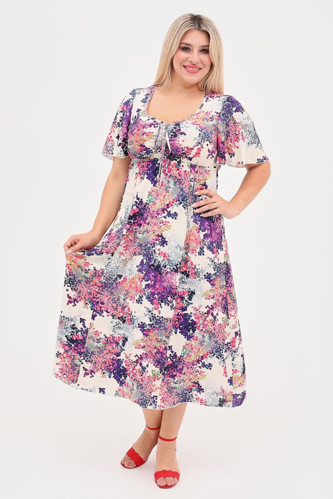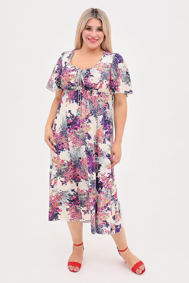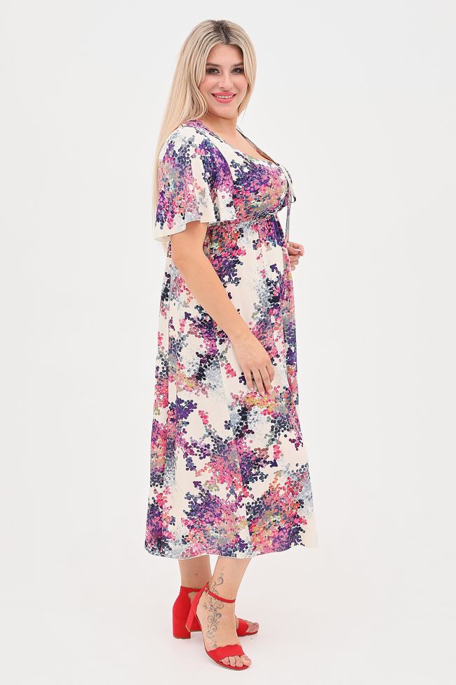 молочный Длинное летнее платье полуприлегающего силуэта из легкой штапельной ткани с цветочным принтом. Фигурный вырез "каре", дополнен стяжкой по центру. Короткие рукава "крылышки" очень удобны в жаркую погоду. Лиф отрезной с завышенной линией талии, на резинке. Низ расклешенный. Низ изделия и рукава оформлены ролевым швом.