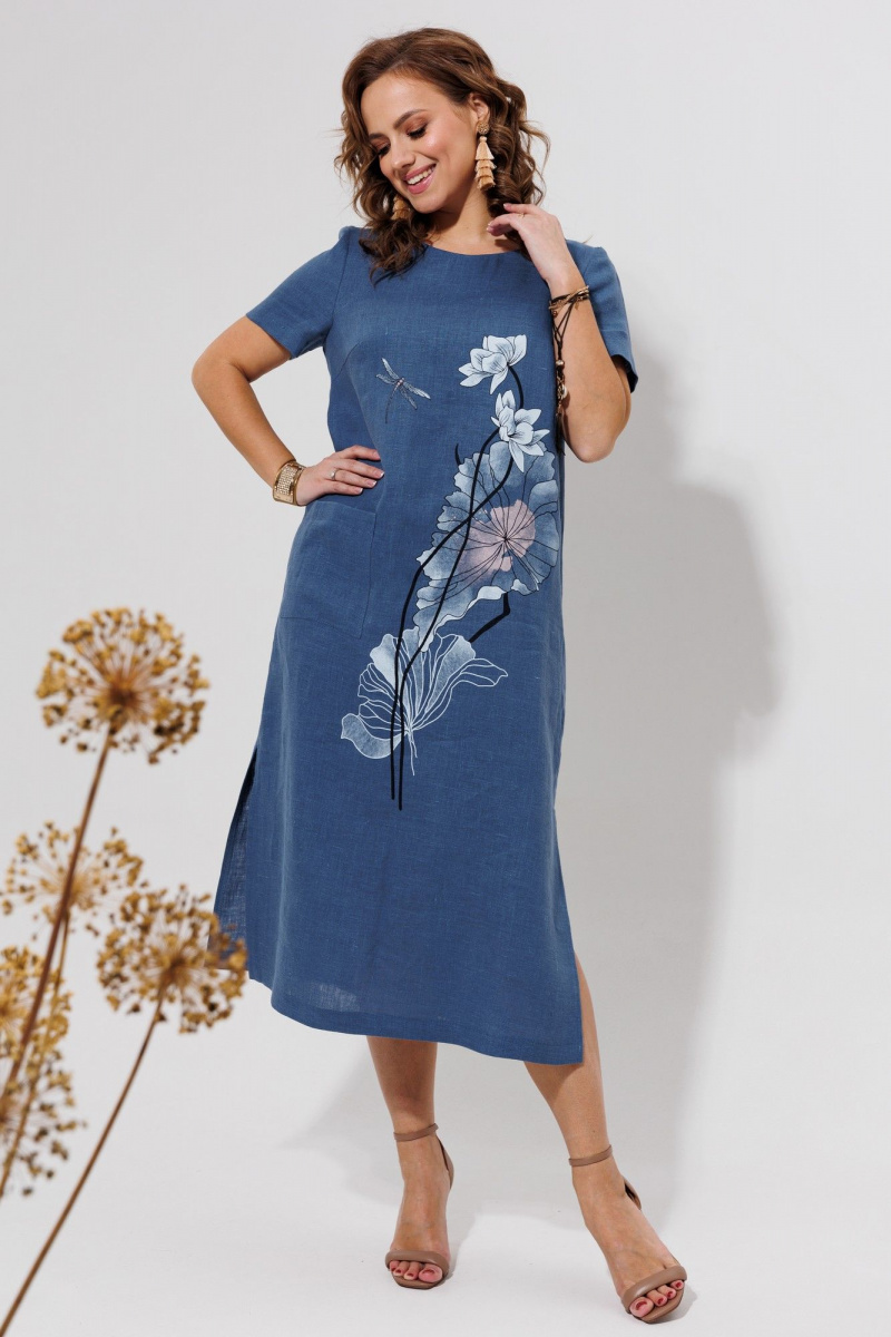 Платье женское слегка расклешённое к низу, льняное. На переде расположена декоративная печать.