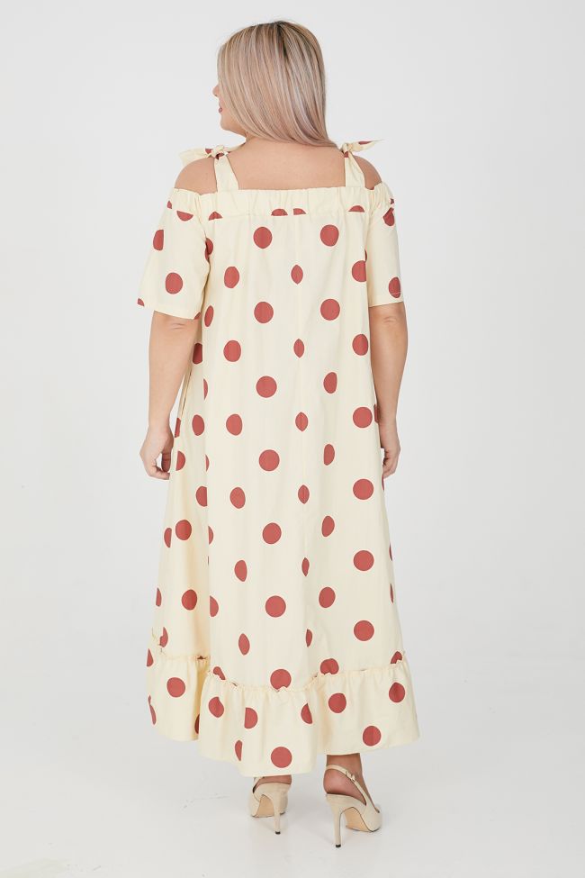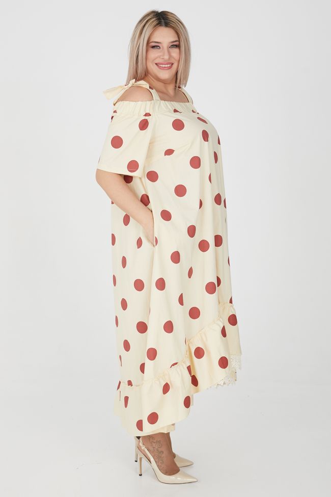 коричневый Длинный сарафан А - образного силуэта из плотного хлопкового полотна с принтом "крупный горох". Прилегание по груди за счет вытачек. В боковых швах удобные карманы. Верх на широкой резине с открытой линией плеча, дополнен широкими бретелями, завязывающимися между собой. Рукава укороченные. Низ изделия разноуровневый с широкой оборкой. По переду оборка двойная, нижний слой оформлен кружевом.