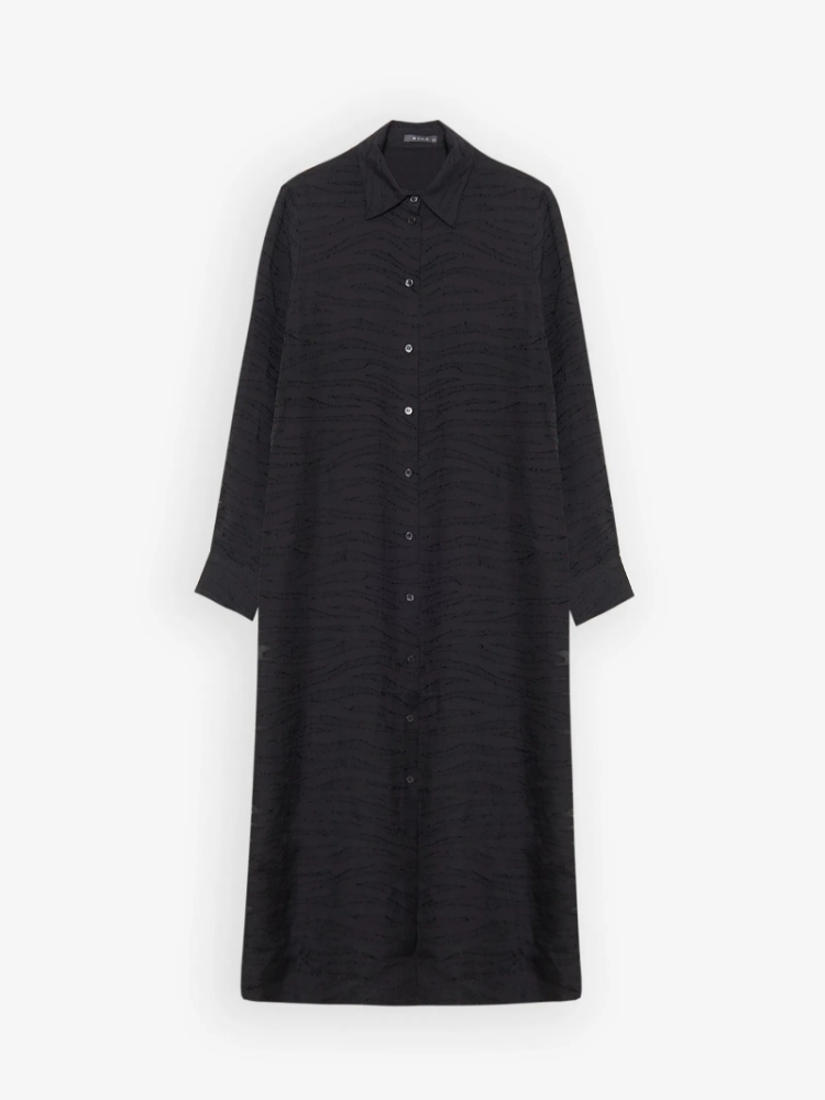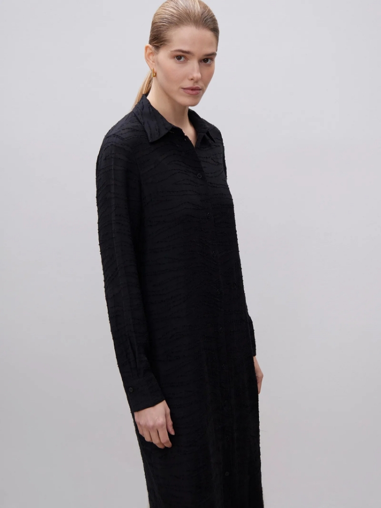 Оригинальное чёрное платье-рубашка с необычной фактурой из вискозы. Модель А-силуэта имеет модную длину миди. Выполнено на комфортной к телу подкладке. Платье станет органичной частью повседневного летнего и демисезонного гардероба