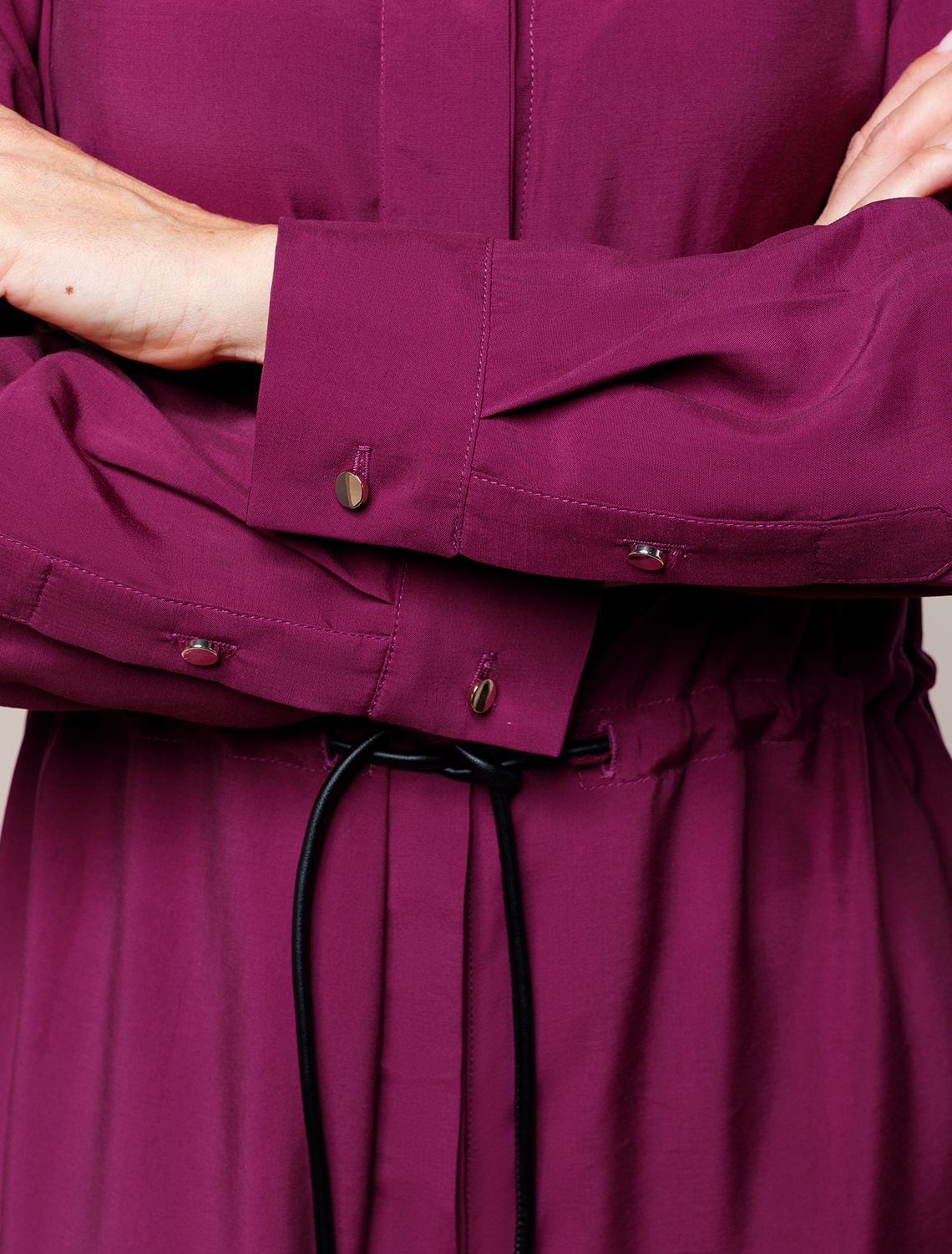 Платье А-силуэта с отложным воротником как у рубашки выполнено из лиоцелла с вискозой. Лаконичная модель с потайной застежкой на пуговицы дополнена боковыми карманами и поясом-шнуром из эко-кожи.Ткань поддерживает оптимальный микроклимат, поэтому изделие подходит для любого сезона. ягодный