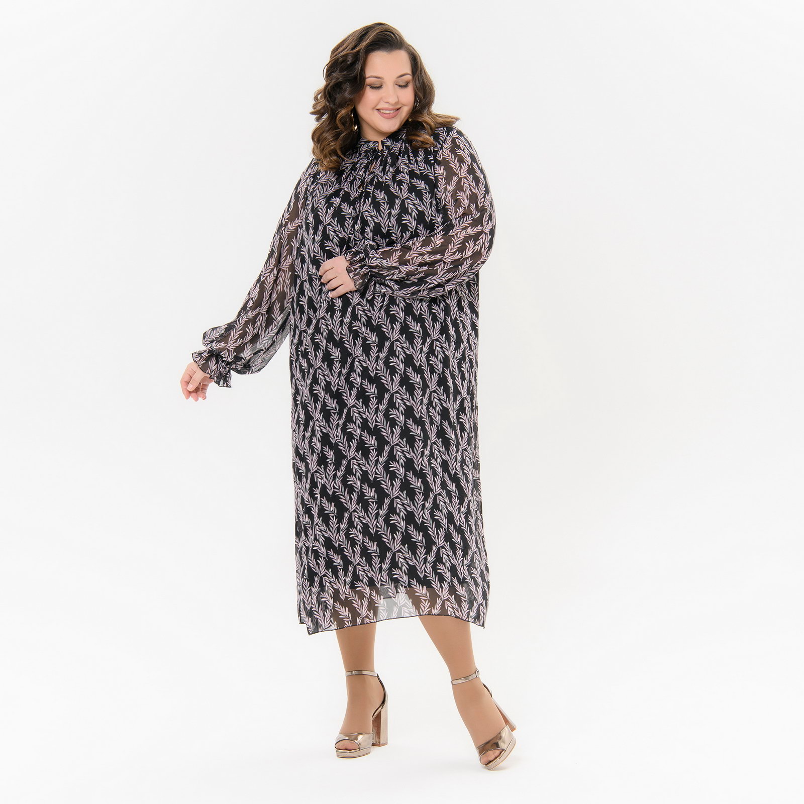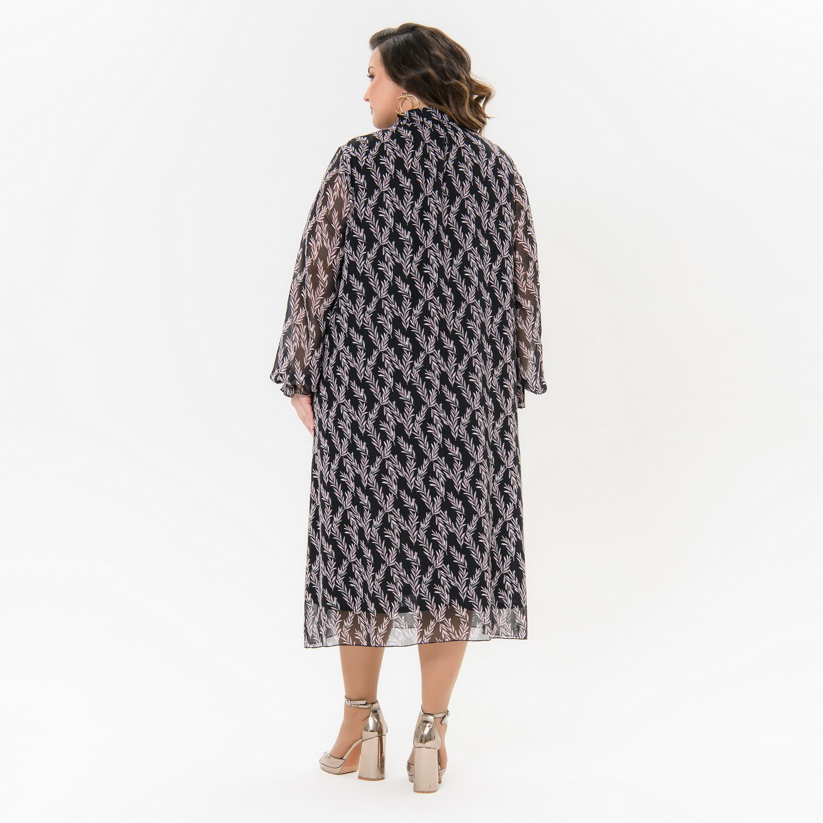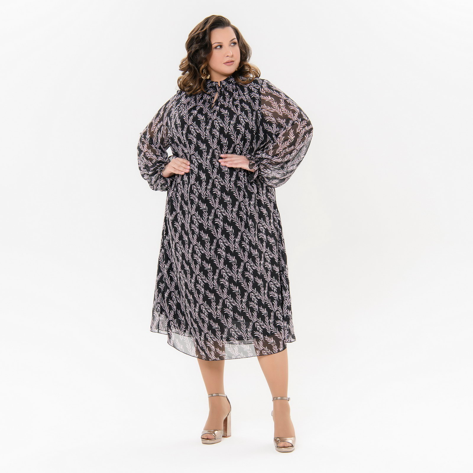 Платье А-силуэта, миди, шифон черный, принт "веточки"