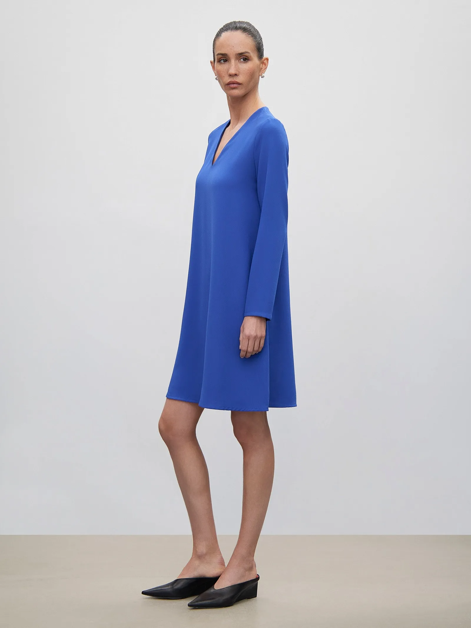Легкое и свободное платье синего цвета. Выполнено из материала с высоким содержанием вискозы, без подкладки. Модель А-силуэта в длине выше колена имеет длинные рукава и универсальный V-образный вырез. Платье отлично подойдёт для повседневных дел. Сочетается с акцентными аксессуарами.