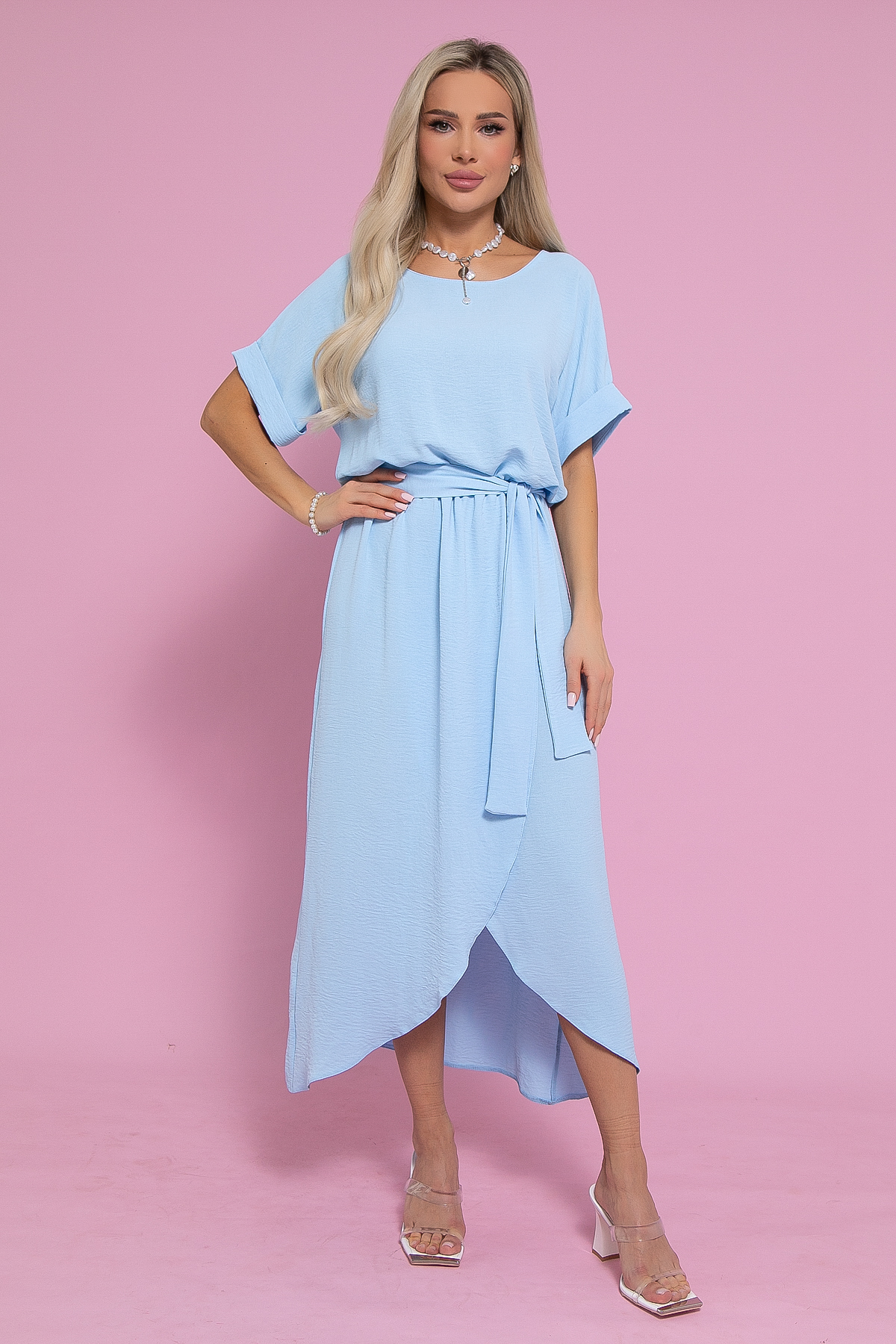 Это летнее платье для повседневных прогулок и встреч станет отличным дополнением вашего гардероба. Модель платья выполнена в длине макси. Свободный верх с округлой горловиной, с цельнокроеным укороченным рукавом. Низ рукава оформлен манжетом. Платье по талии на резинке. Низ изделия скроен на запах, что обеспечивает свободу в движении. В комплект входит пояс из основной ткани, который подчеркивает все достоинства фигуры.