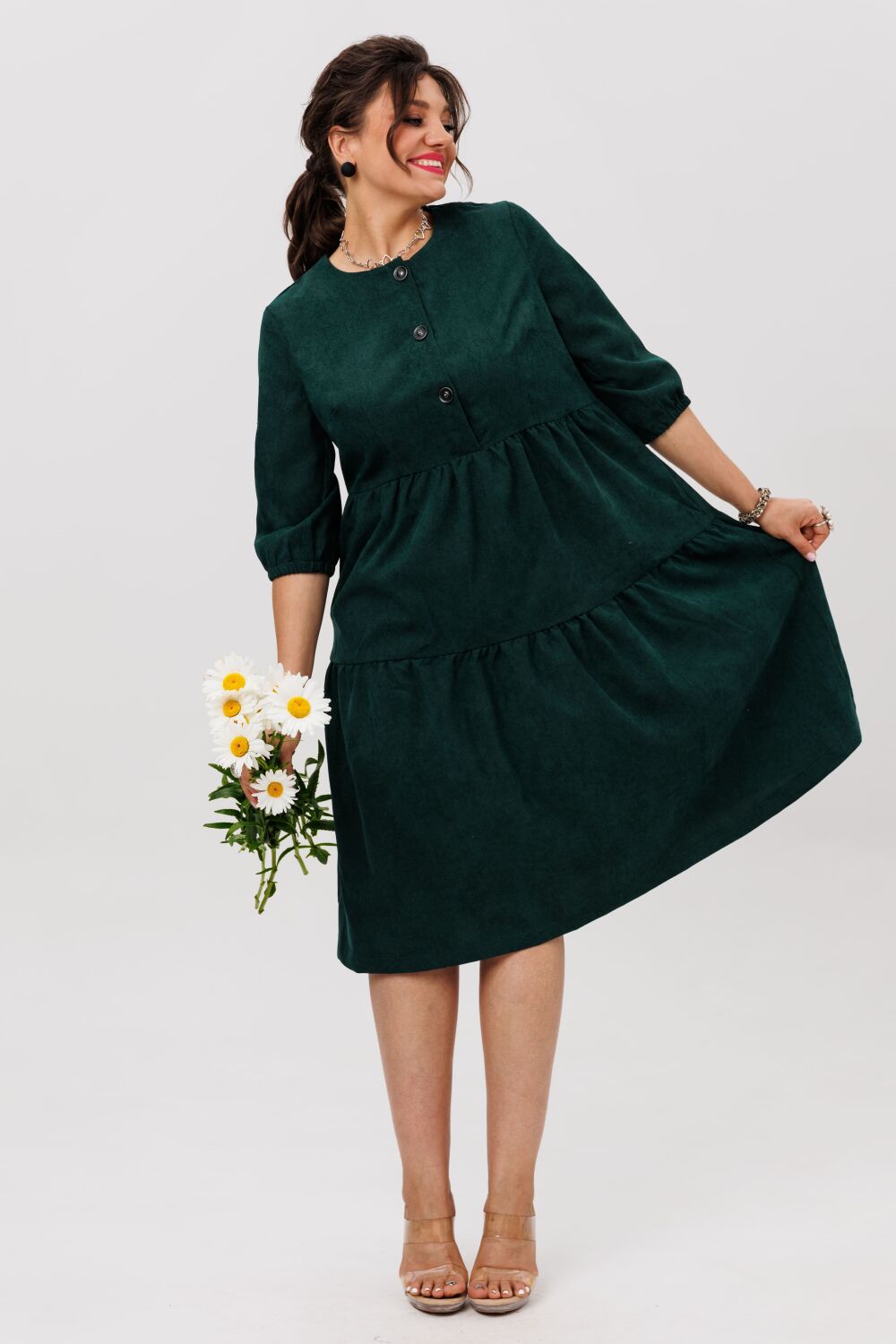 Отрезной лиф под грудью и свободный покрой дарят невероятную лёгкость и комфорт, позволяя чувствовать себя непринуждённо и собранно одновременно. А изысканный цвет «аристократический зеленый» добавляет образу элегантности.