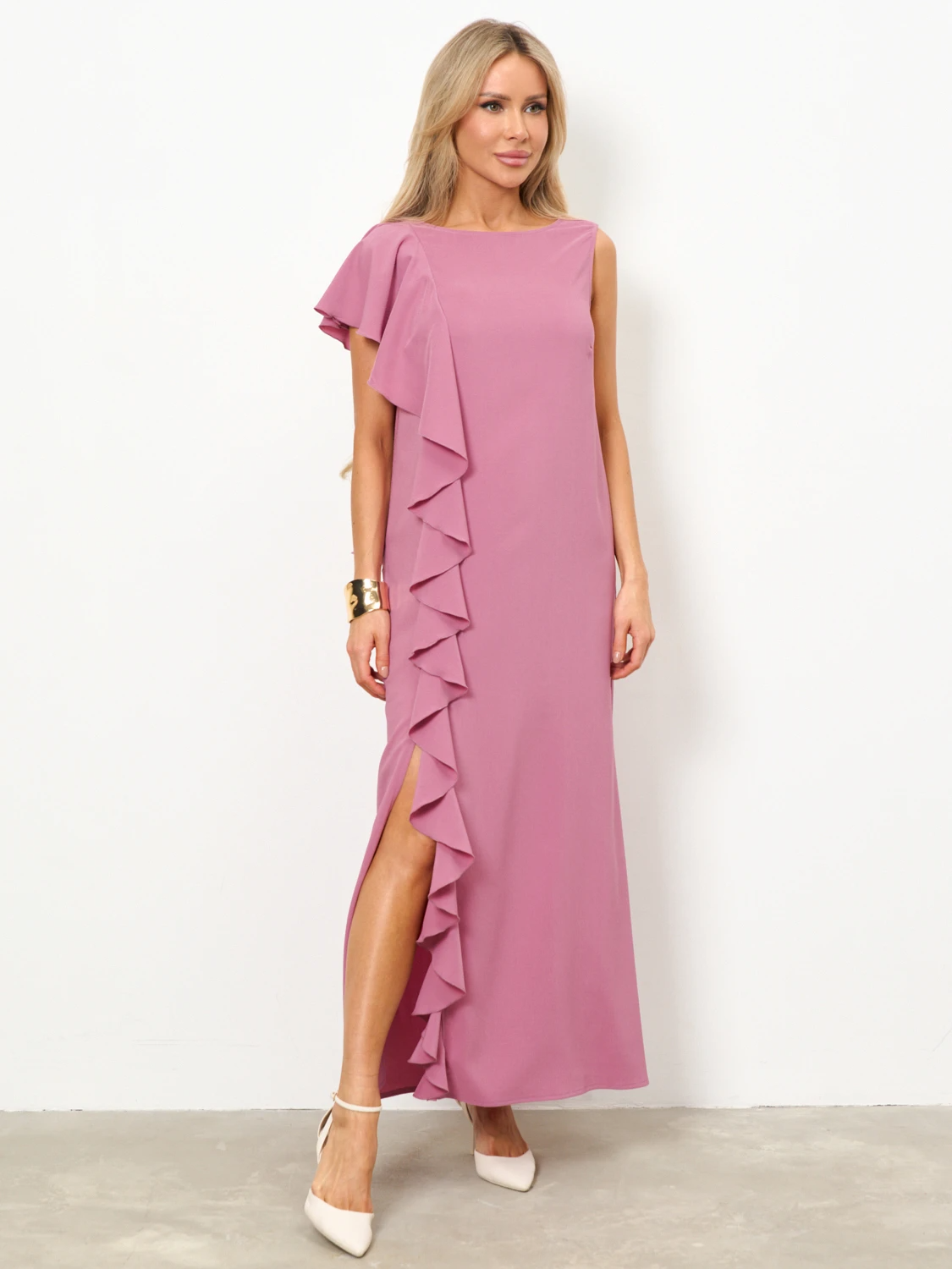 Перед  и спинка с одной стороны изделия декорированы пришивным воланом,  который  мягко ложится на плечо  и имитирует рукав.