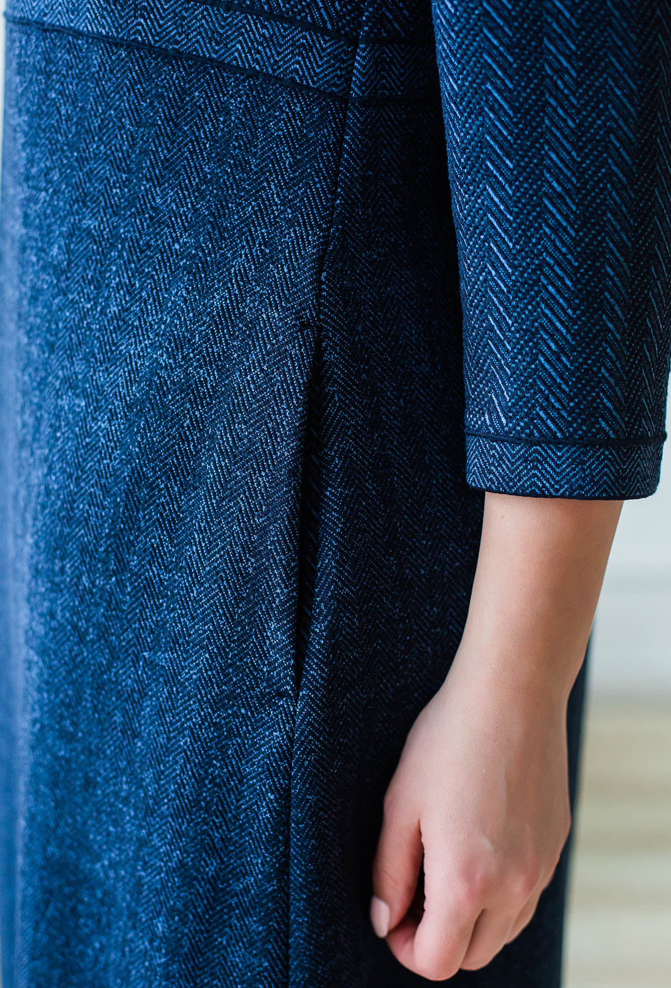Платье силуэта трапеция с рукавом 3/4. Горловина округлая, карманы в боковом шве.