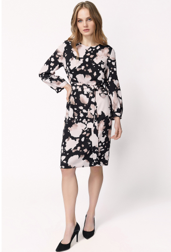 Платье-миди Х-образного силуэта, отрезное по линии талии. Верхняя часть переда с эффектом запаха и фигурной формой борта. Рукава втачные двушовные. Воротник – стойка. Дополняется поясом с пряжкой из основной ткани.