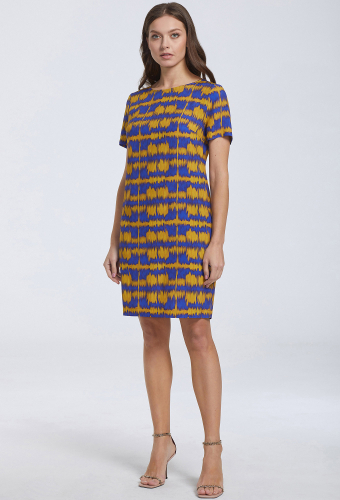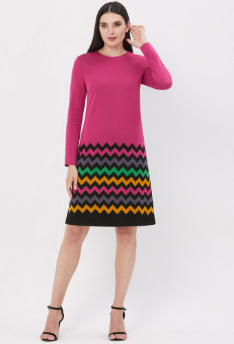 Яркое, запоминающееся платье А-образного силуэта с округлой формой горловины выполнили из мягкого итальянского трикотажа с добавлением вискозы с интересным геометрическим принтом. По спинке обработана застёжка на навесную петлю и пуговицу. Рукава втачные одношовные.