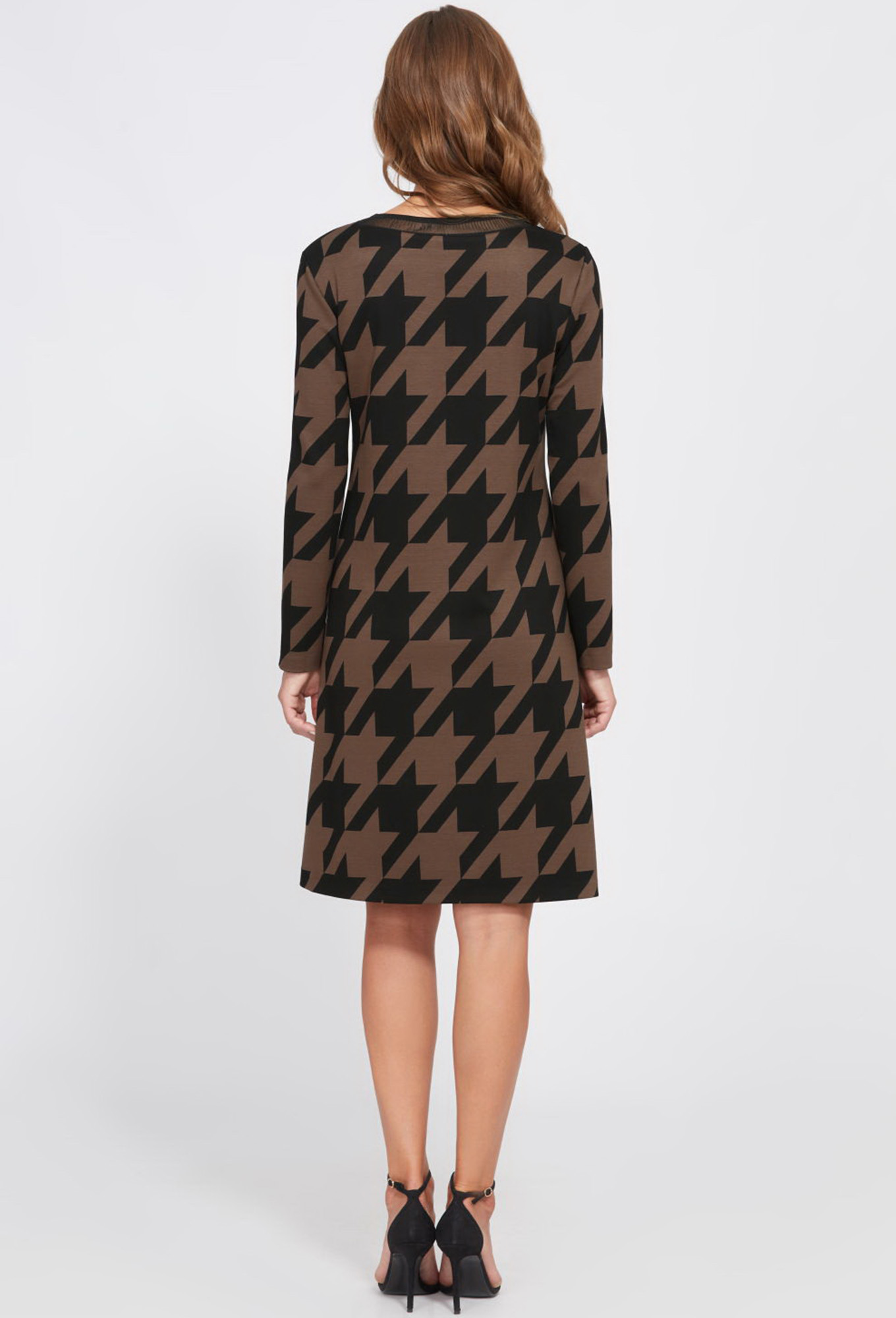 Платье А-образного силуэта с длинными втачными рукавами не только эффектно смотрится, благодаря интересному дизайну в виде крупной гусиной лапки, но и не уступает в вопросах комфорта, так как сшито из мягкого приятного к телу итальянского трикотажа с добавлением вискозы. Горловина изделия обработана отделочной трикотажной тесьмой. Платье будет уместно смотреться как в офисе с нестрогим дресс-кодом, а также прекрасно подойдёт для светского мероприятия.