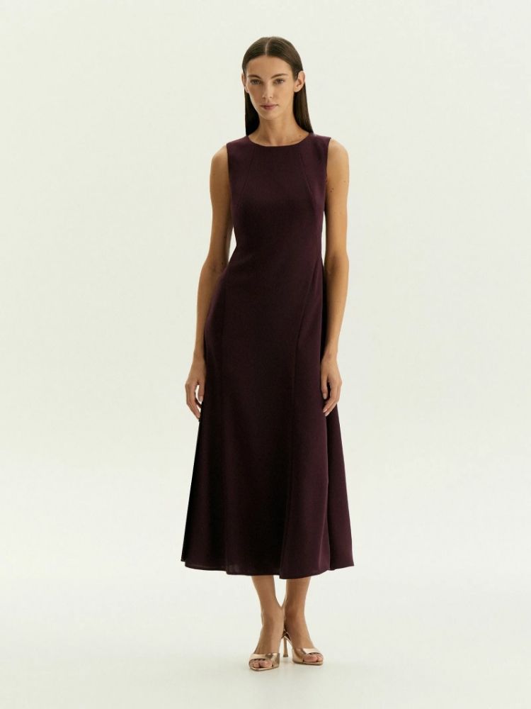 Платье мидакси без рукавов подойдёт на каждый день и к особым случаям. Отличный вариант для образов с тонкими лонгсливами из сетки или жакетами. Рельефы визуально сужают области бёдер и плеч, а в нижней части платья также создают более динамичную конструкцию платья, которая эффектно раскрывается в движении. Цвет инжира — среди ключевых в новом сезоне; он делает образ актуальным, дорого и благородно выглядит, органично вписывается в деловой дресс-код. Платье выполнено без подкладки