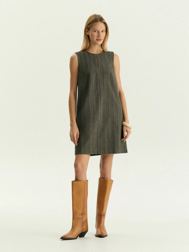 Удобное, тёплое и модное платье для современного офисного гардероба. Мягкий материал с актуальным узором-ёлочкой содержит в составе шерсть и эластан.Длина выше колена сочетается с высокими зимними сапогами. Модель без рукавов хорошо подходит для образов с жакетами. Платье можно носить как второй слой на тонкие, в том числе прозрачные, лонгсливы. Спереди в районе груди располагается узкий, неброский разрез-капля. Изделие выполнено на подкладке с высоким содержанием вискозы. Застёгивается сзади на молнию. Платье может стать частью капсулы с жакетом и юбкой из линейки spartacus