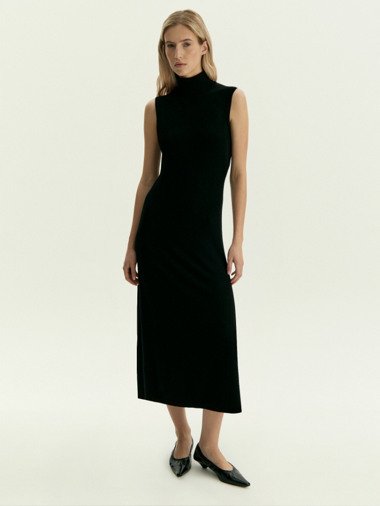 Незаменимая вещь для базового гардероба к межсезонью и зиме — вязаное платье мидакси без рукавов и с высоким горлом. Ворот защищает горло, а удобные глубокие проймы идеальны для образов с жакетами, кардиганами и верхней одеждой. Приталенная модель красиво садится по фигуре, воротник изящно охватывает шею. Мягкий материал тонкой вязки сделан на основе комфортной к телу вискозы. Платье в чёрном цвете универсально и имеет широкую сочетаемость. Подходит на каждый день и для особых случаев. За счёт своей лаконичности позволяет экспериментировать с акцентными аксессуарами и яркой помадой