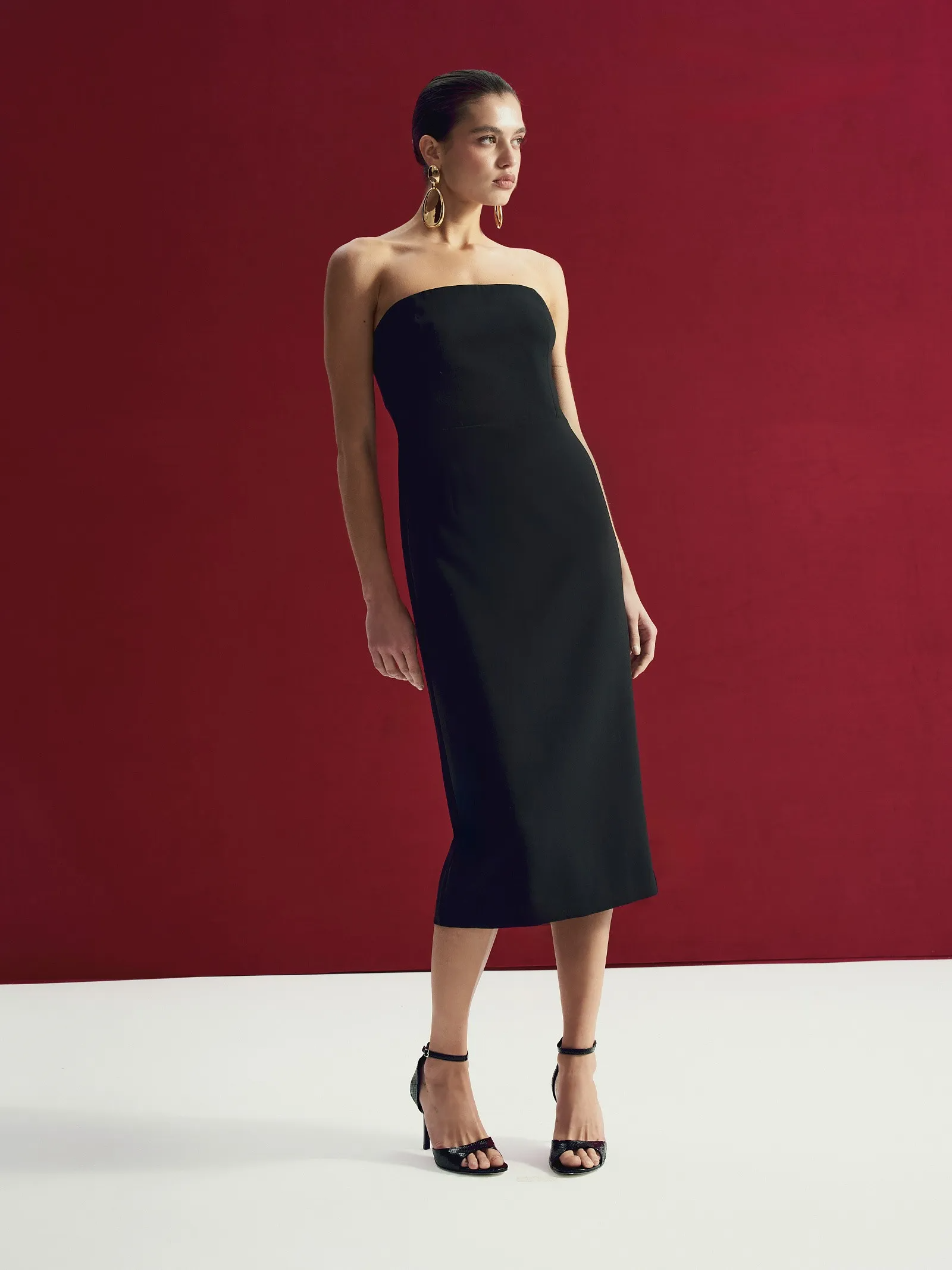 Внутри предусмотрены фиксирующие силиконовые полоски — чтобы и в качестве первого слоя платье сидело безупречно. Бретели съемные и регулируемые.