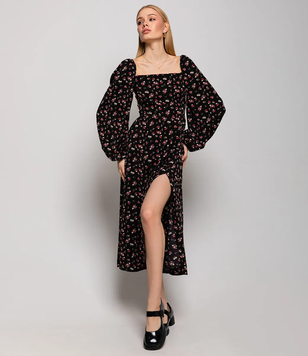 Легкое и воздушное платье в цветочек. Яркий дизайн и деталь в виде открытой спины.
