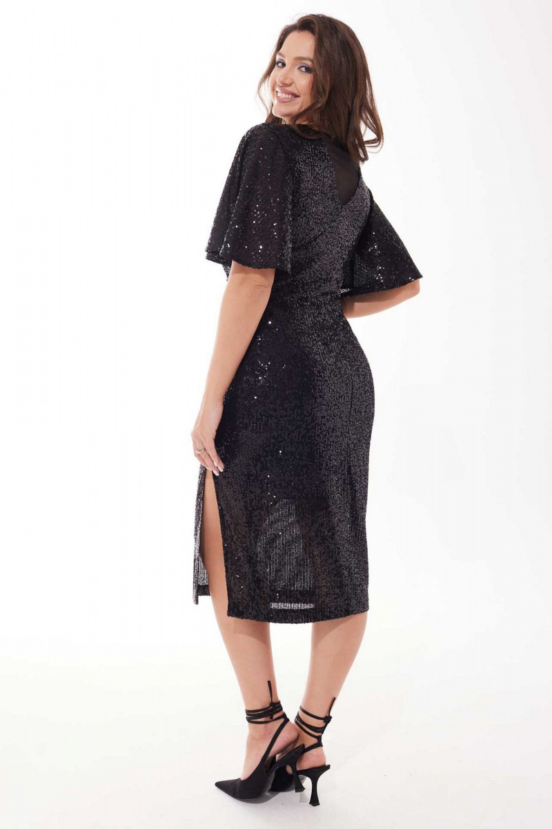 Платье прилегающего силуэта с V-образной горловиной. Втачной рукав-крылышко. Перед платья с драпировкой, входящей в боковой рельеф. По низу рельефа - разрез. Спинка отрезная по линии талии со средним швом. В горловине спинки вставлена детель из сетки. Платье на подкладке.
