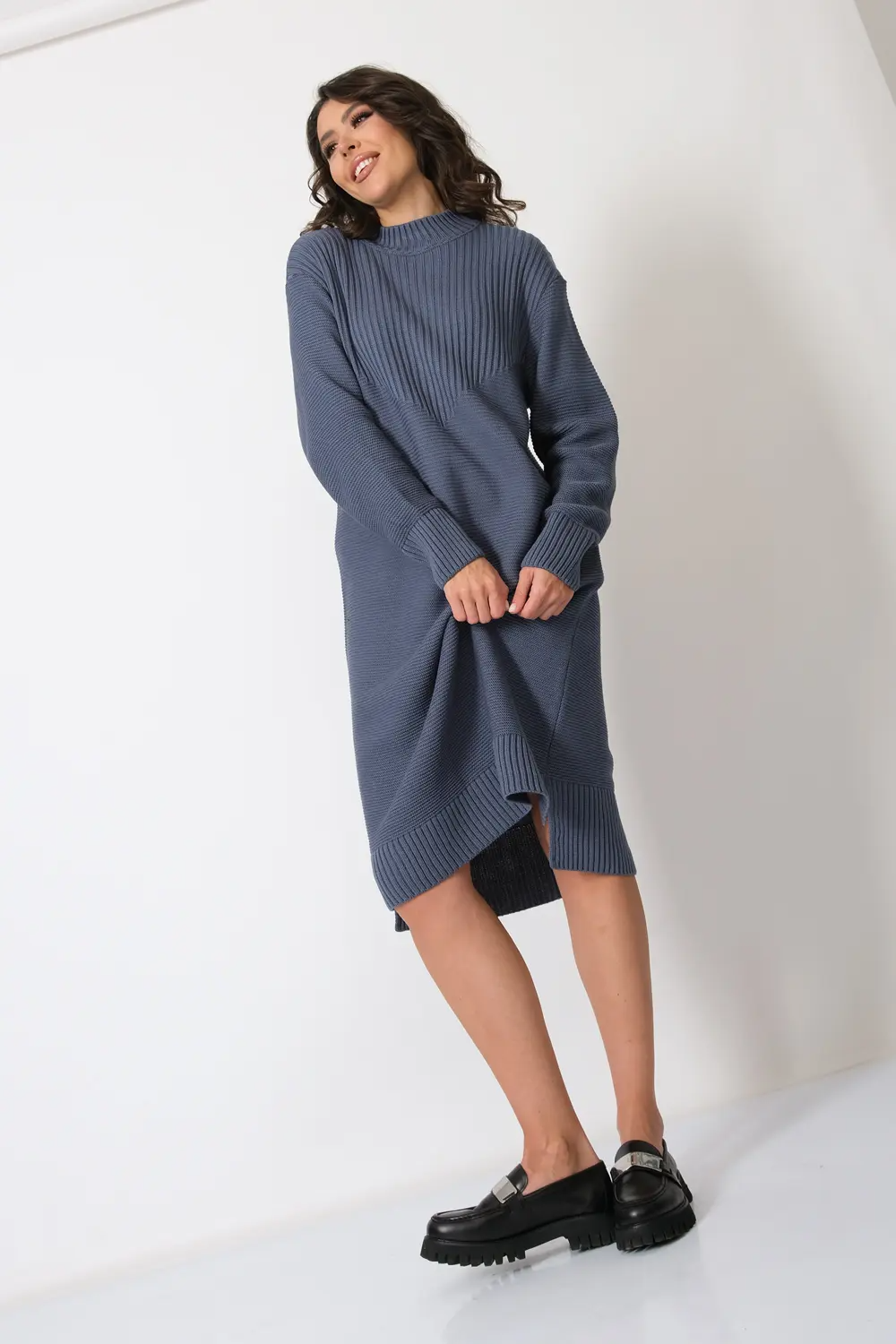 Платье прямого силуэта из трикотажного вязанного полотна с воротником-стойка, спущенным плечом и рукавом полной длины. Кокетка спинки и полочки выполнено переплетением образующим рельефный вертикальный рисунок.