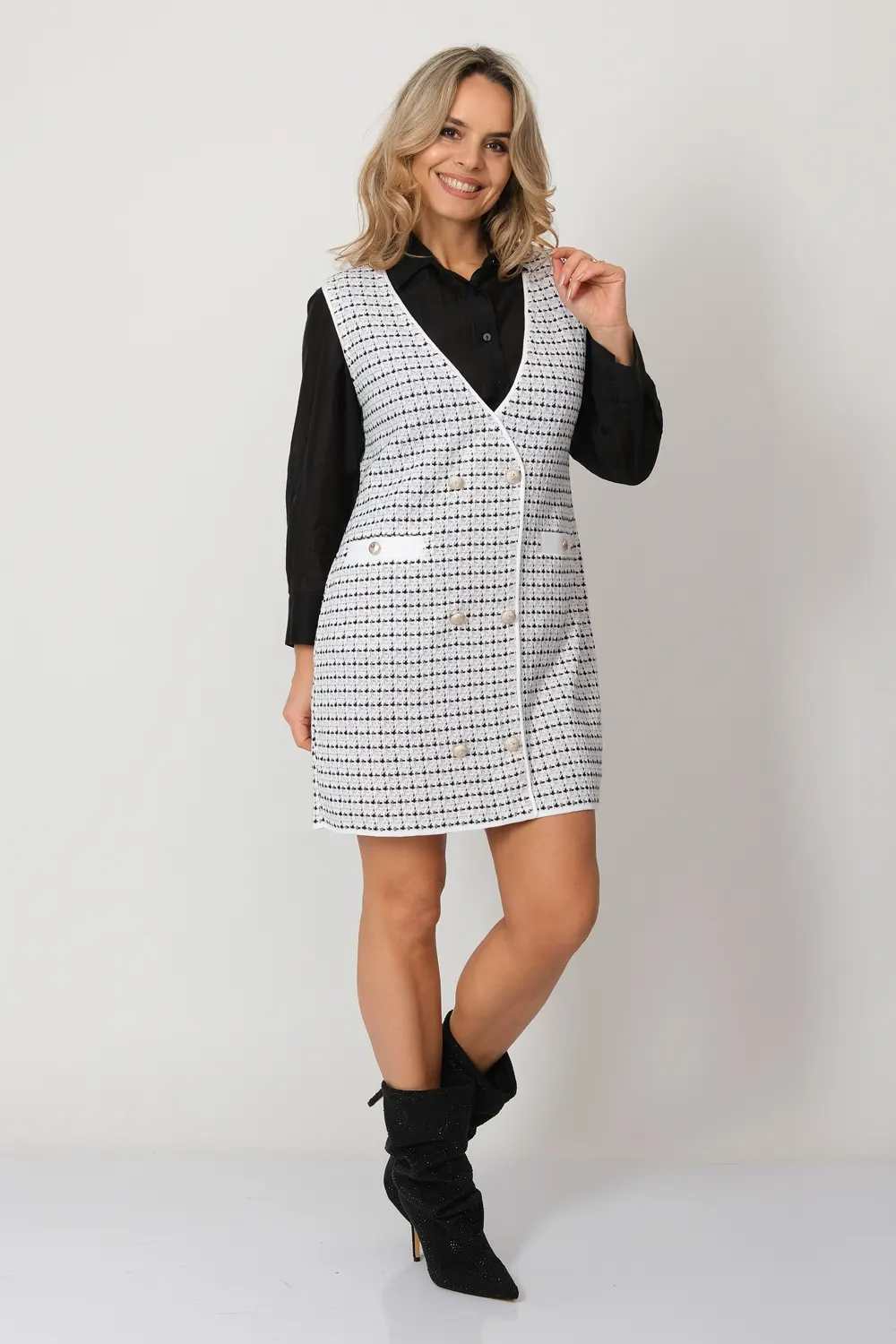 Вязанное женское платье-сарафан полуприлегающего силуэта. Имитация застежки на  пуговицы. Сарафан выполнен жаккардовым структурным переплетением рисунок клетка. Это универсальная модель для осеннего сезона, которая идеально подойдет для прохладных дней. Уютный и мягкий материал с добавлением хлопка гарантирует комфорт и тепло в течение всего дня. Платье-сарафан для офисного, повседневного и делового стиля, будет отлично сочетаться с водолазками, рубашками, блузками, джемперами или футболками. белый