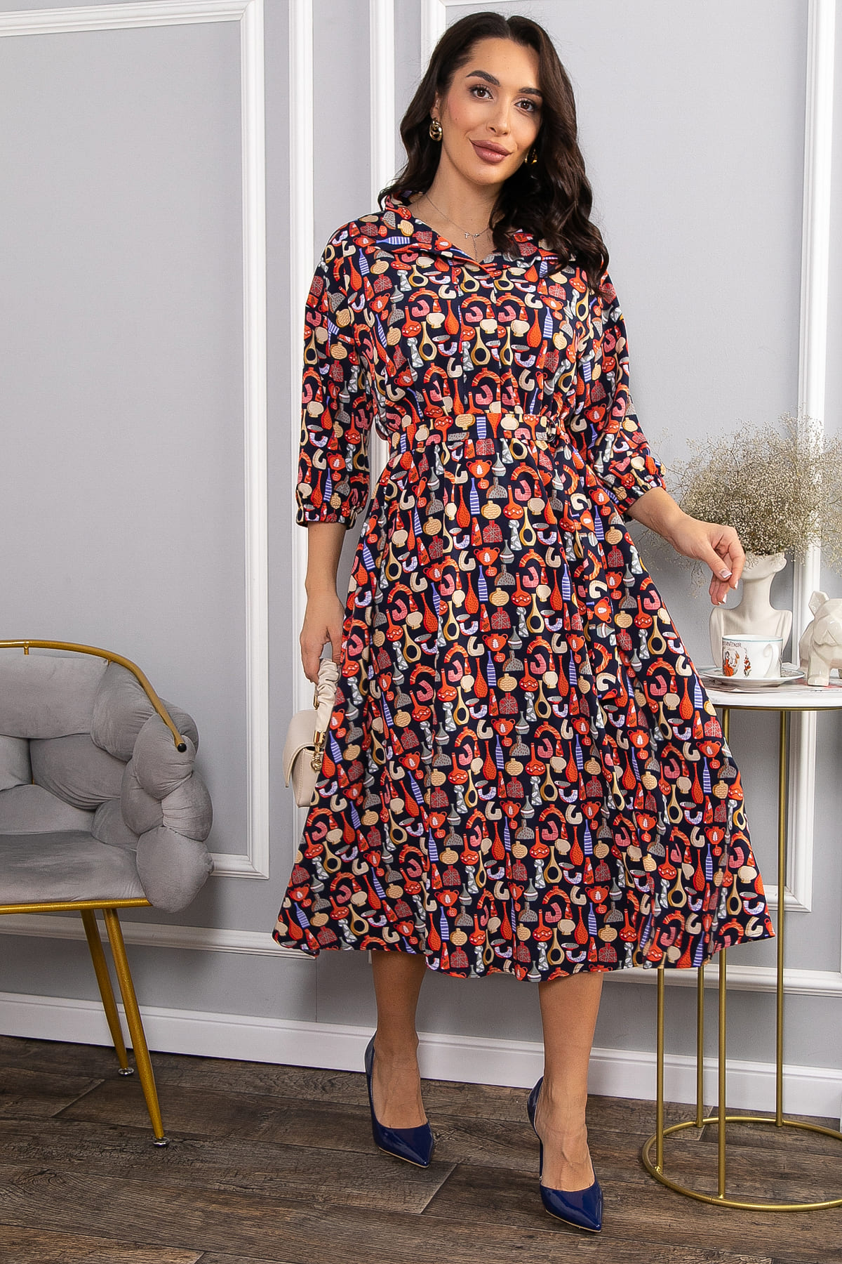 Легкое платье для повседневного использования, подходящее для любого сезона. Модель отличается воротником-стойкой и спущенной линией плеча, что придаёт образу непринужденность и удобство. Карманы в боковых швах делают изделие практичным, а отрезной пояс на резинке, расположенный по талии, обеспечивает идеальную посадку и подчеркивает фигуру. Широкая резинка по низу рукавов заменяет обычные манжеты. В комплект входит пояс, который завершает образ и добавляет стильные акценты. Оригинальный принт с вазами делает платье уникальным и ярким, привлекая внимание и делая его запоминающимся. Это универсальное решение для повседневного гардероба, создающее легкий, но элегантный вид.