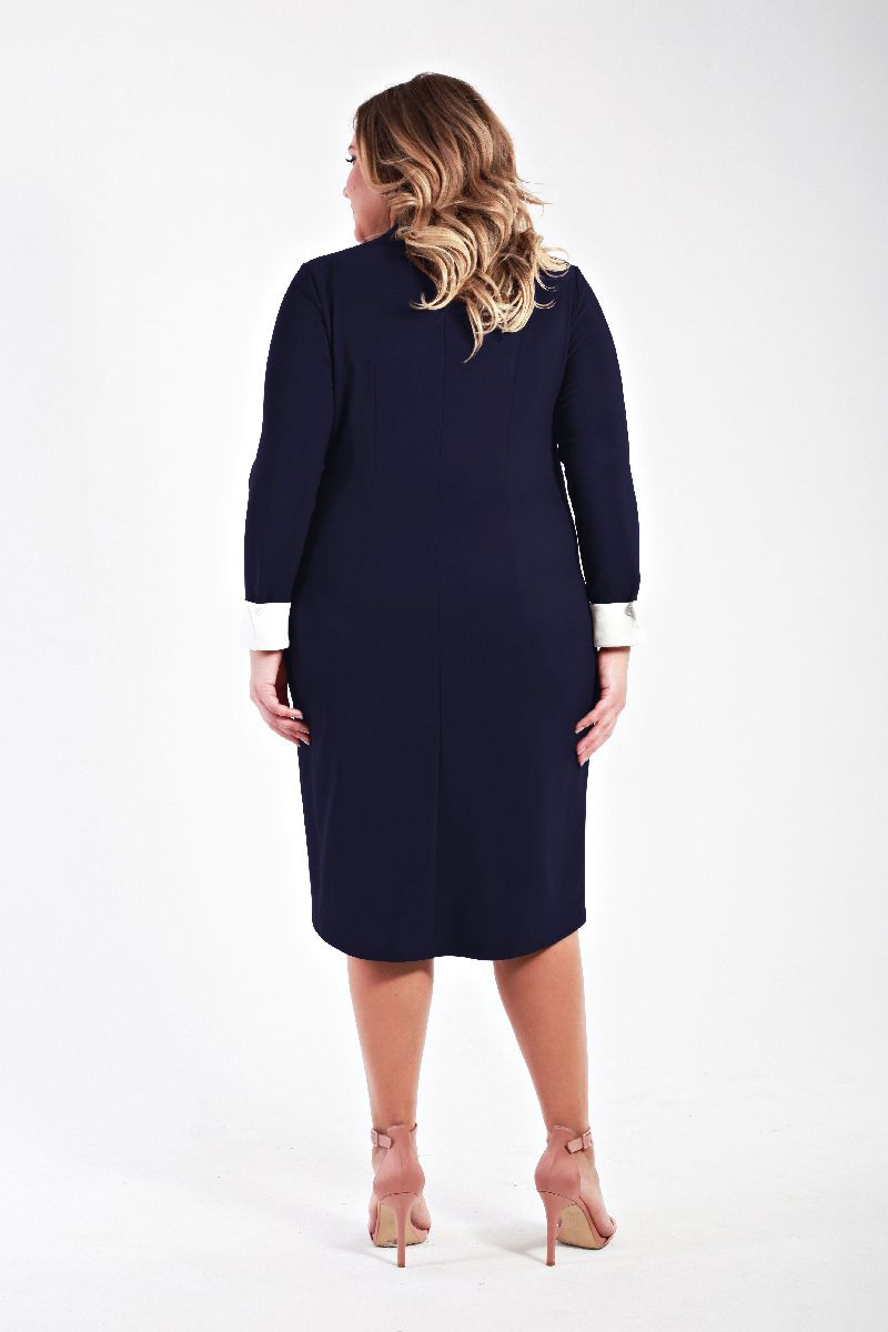 Синий Изысканное платье полуприлегающего силуэта из джерси с антипиллинговой обработкой. V-образный вытянутый вырез спереди переходит в аккуратную цельнокроенную стойку на спинке, подчеркивая красоту линий. Под грудью - подрез. Рукава заканчиваются манжетами с уголками, скрепленными пуговками со стразами. Низ платья асимметричный. Платье полностью соответствует выражению: "и в пир, и в мир".