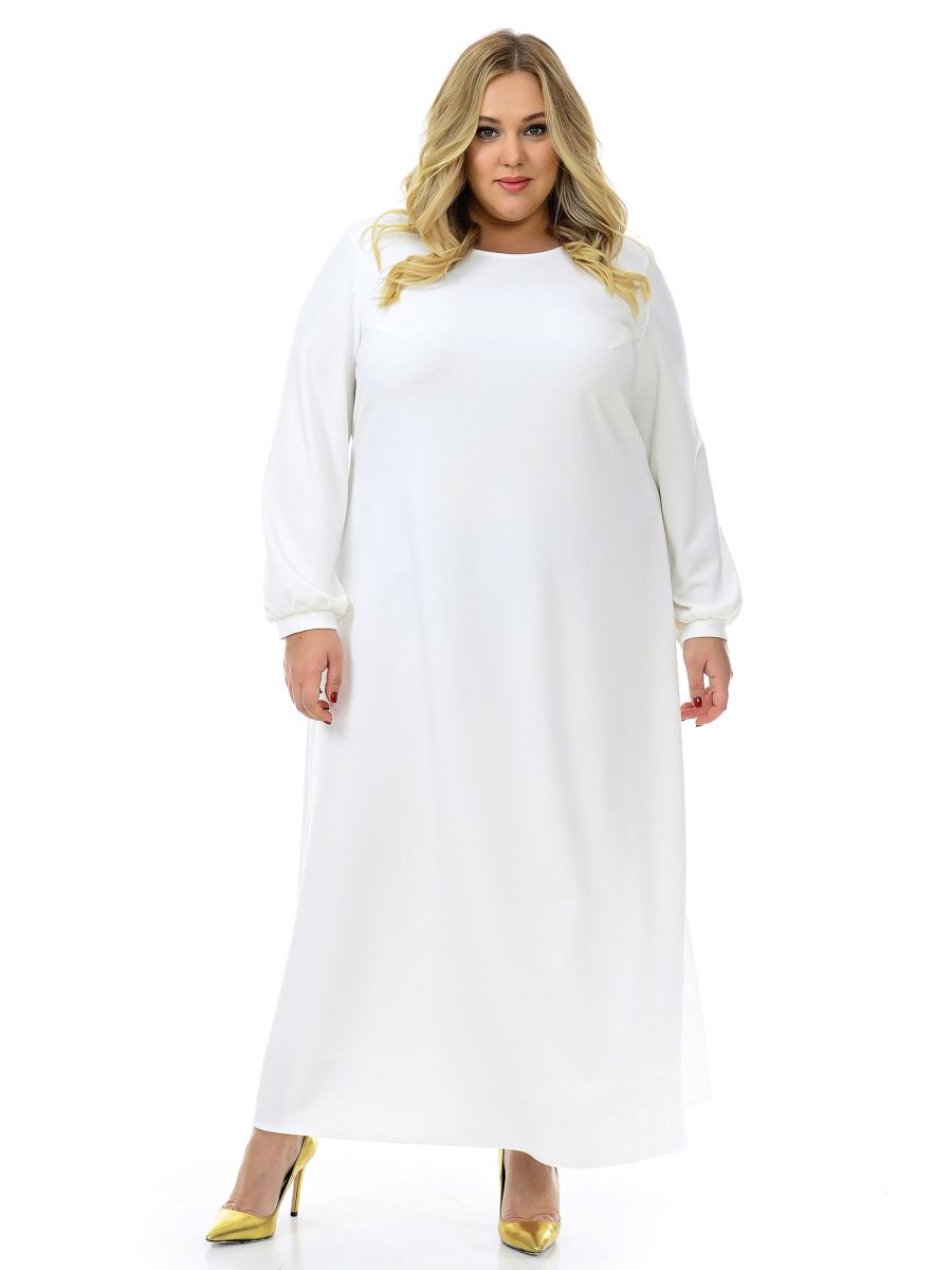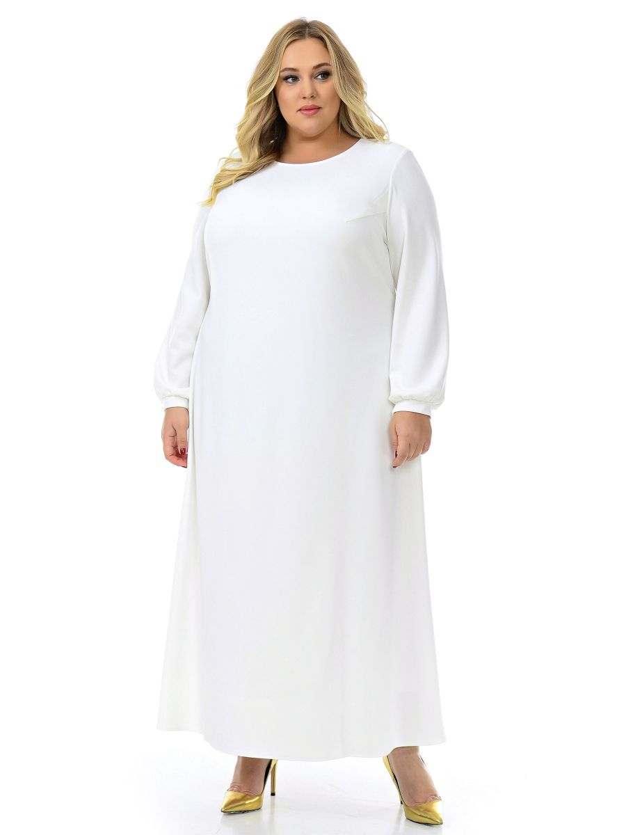 Белый Длинное платье А-силуэта из крепа с эластаном. Вырез горловины округлый. По центру горловины спинки вырез "капля", застегивающийся на хрустальную пуговицу. Рукав длинный, по низу легкая сборка, на манжете.
