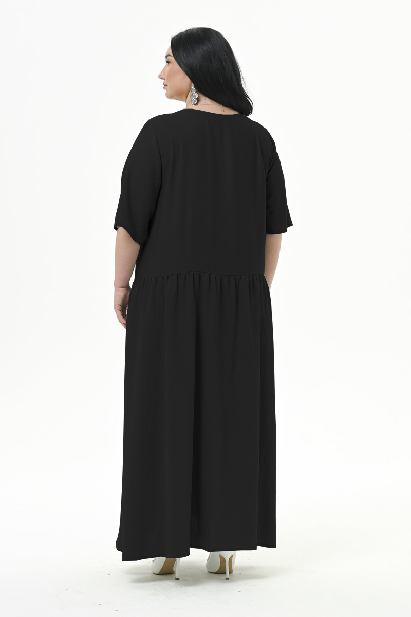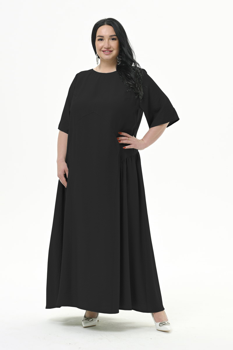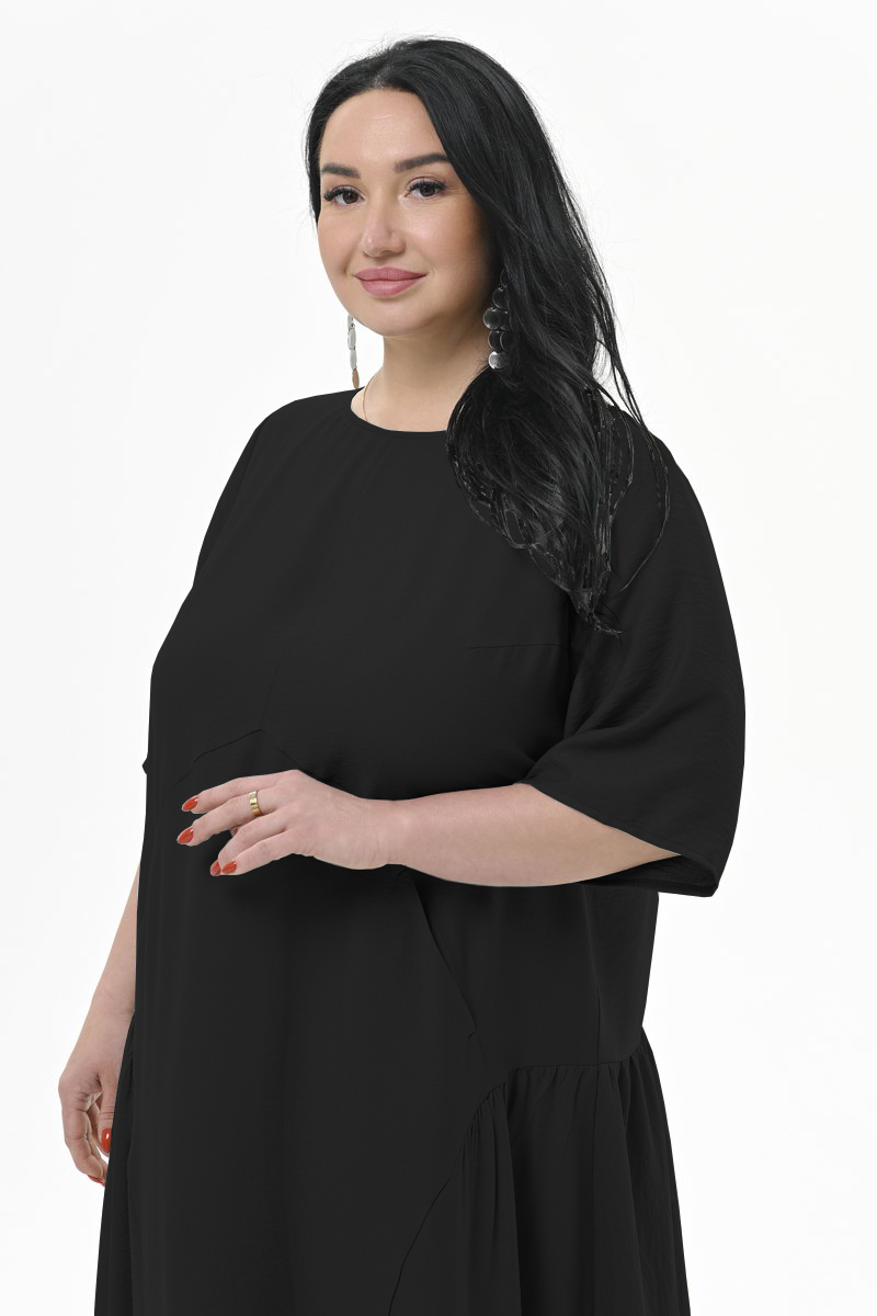 Черный Платье длинное, свободного силуэта, из плотной плательной ткани. Нижняя часть платья отрезная, присборенная. Линия подреза по переду фигурная, по спинке горизонтальная.  В швах подрезов обработаны карманы. Рукав втачной, свободный.