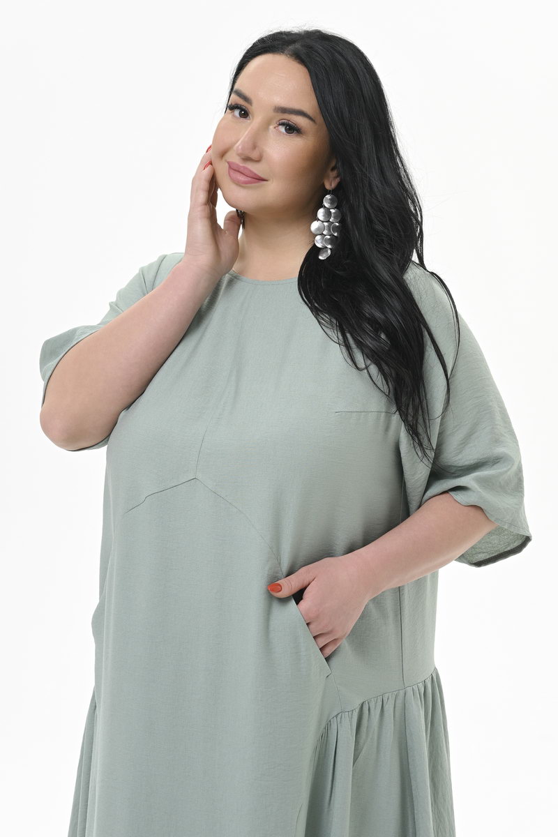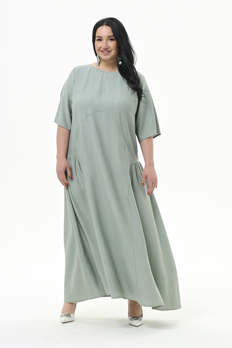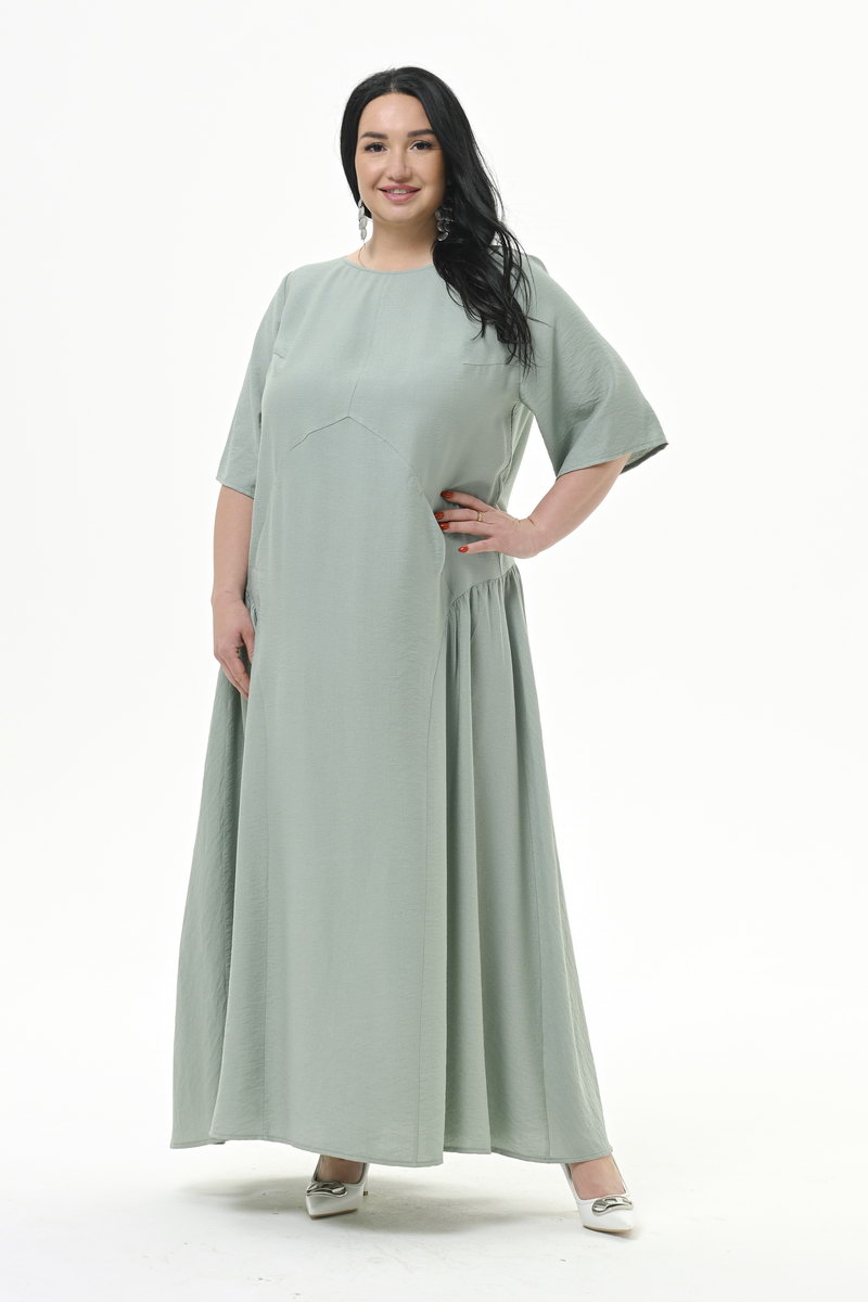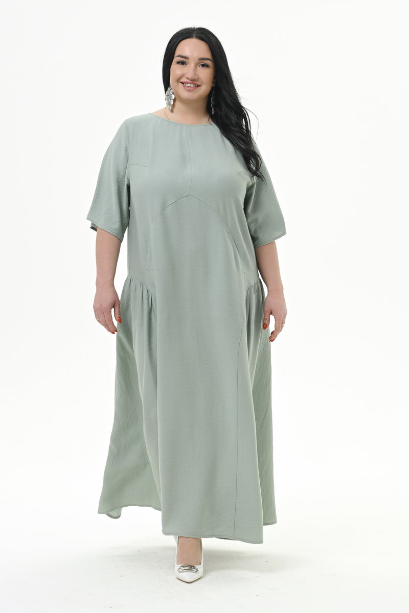 Ментоловый Платье длинное, свободного силуэта, из плотной плательной ткани. Нижняя часть платья отрезная, присборенная. Линия подреза по переду фигурная, по спинке горизонтальная.  В швах подрезов обработаны карманы. Рукав втачной, свободный.