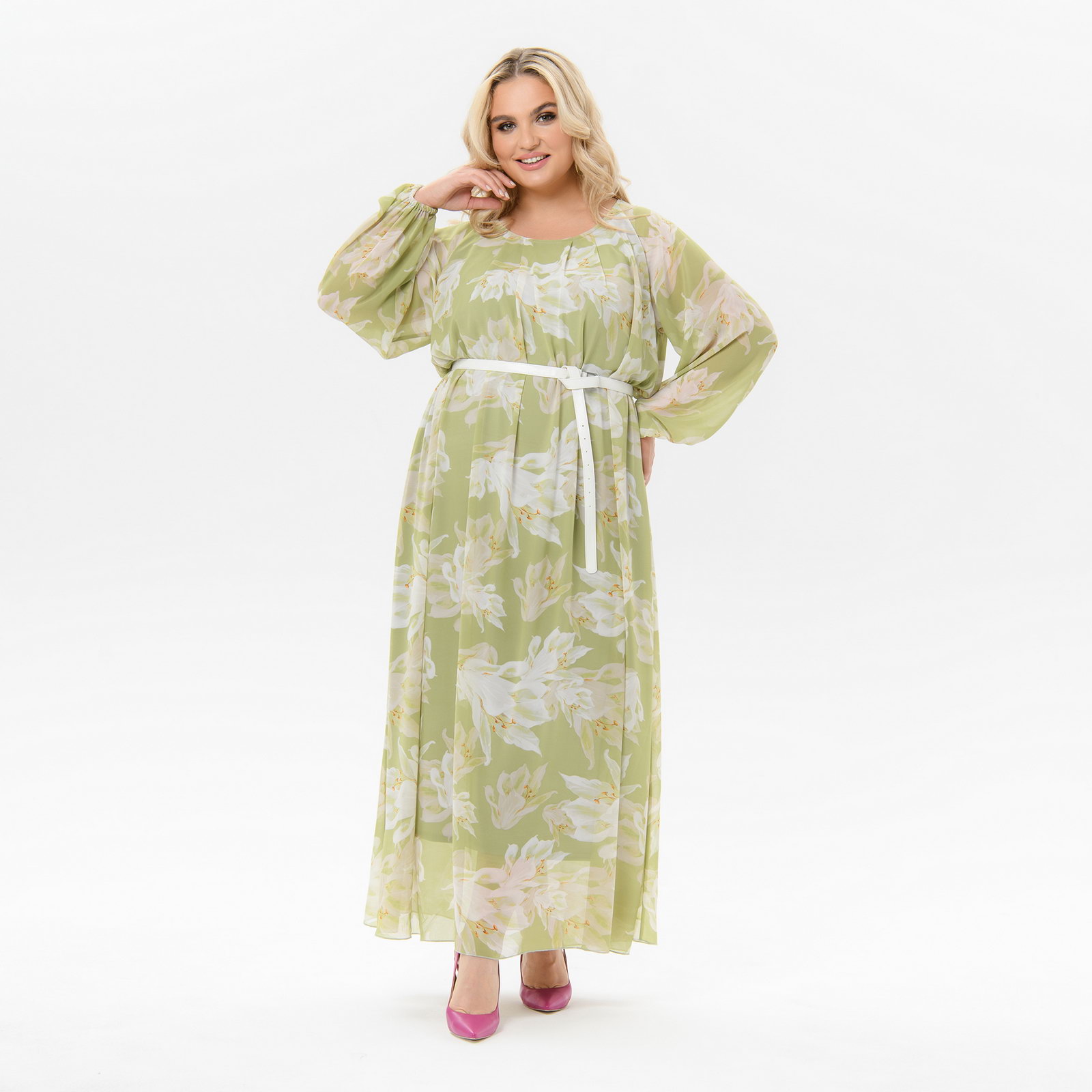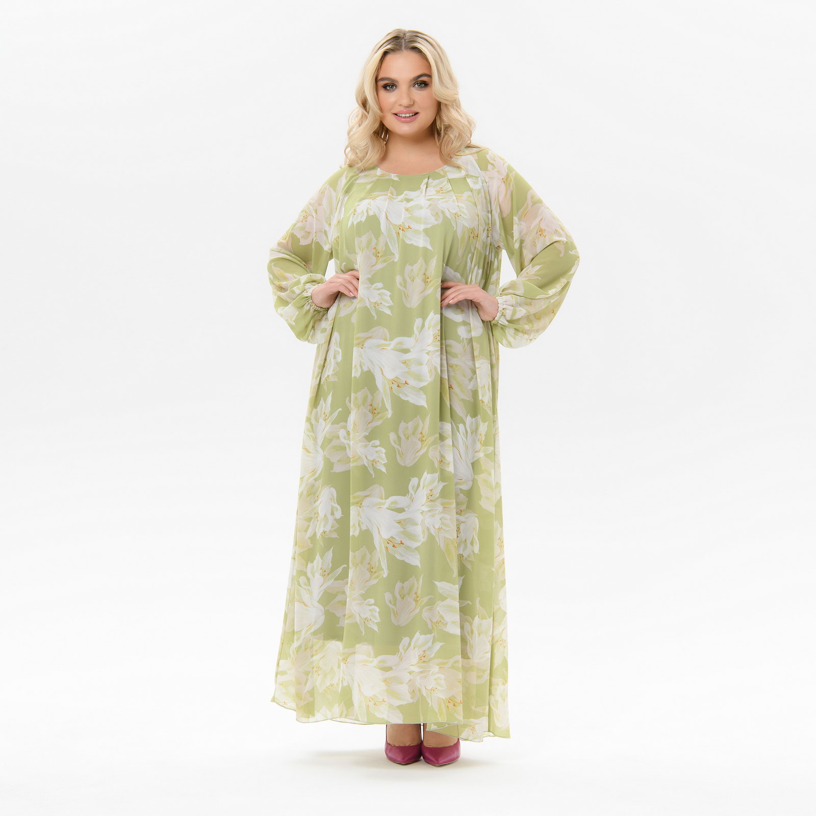 Платье длинное из шифона, мятное, принт "лилии" *