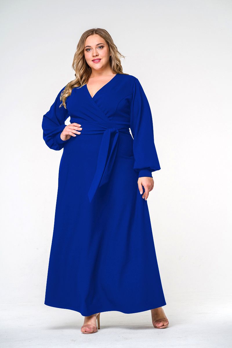 Платье длинное однотонное. Верхняя часть с запАхом, рукав длинный свободный на манжете. Линия талии подчеркнута поясом в тон платья.