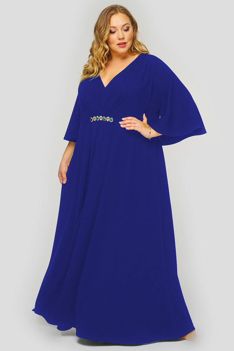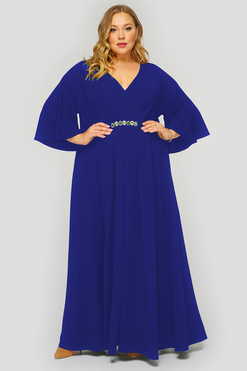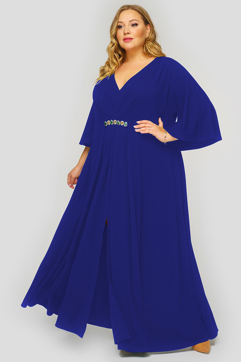 Васильковый Длинное вечернее платье из эластичного крепа. V-образный вырез  горловины. Рукав расклешенный, цельнокроенный. Юбка отрезная, с мягкими складками по талии и разрезом по центру передней половинки.