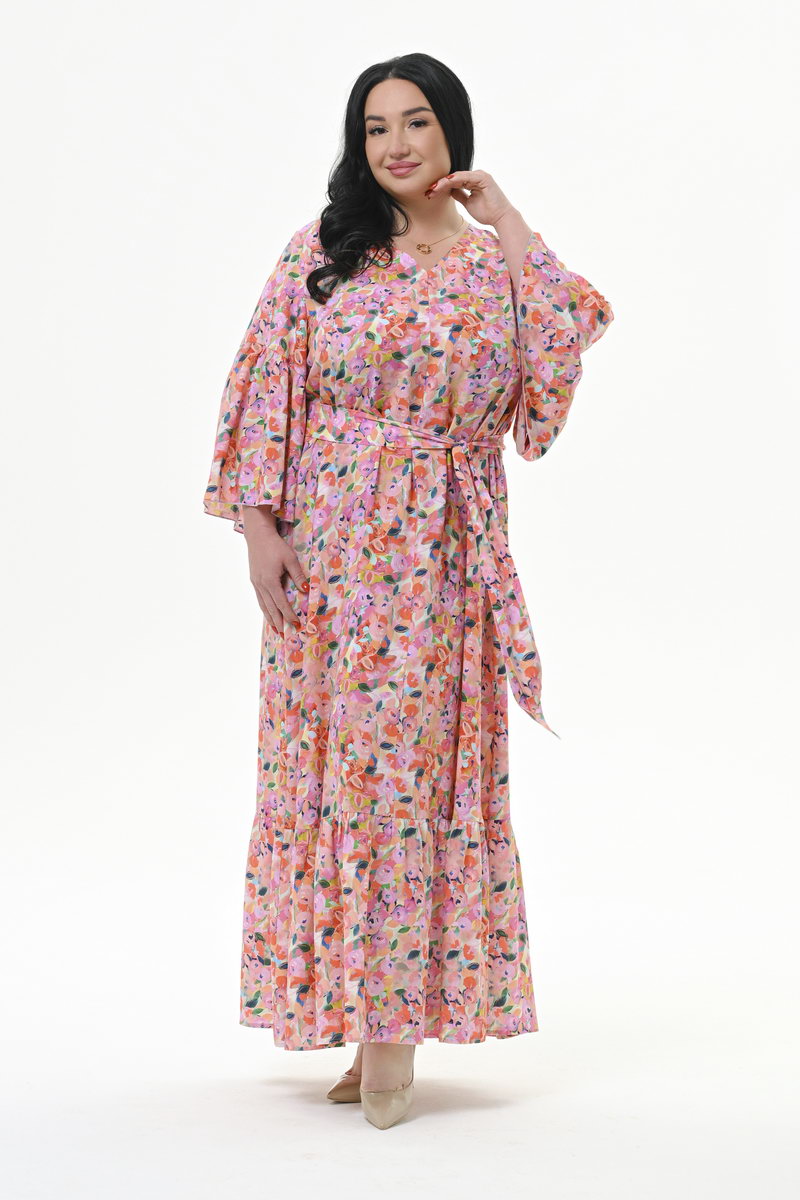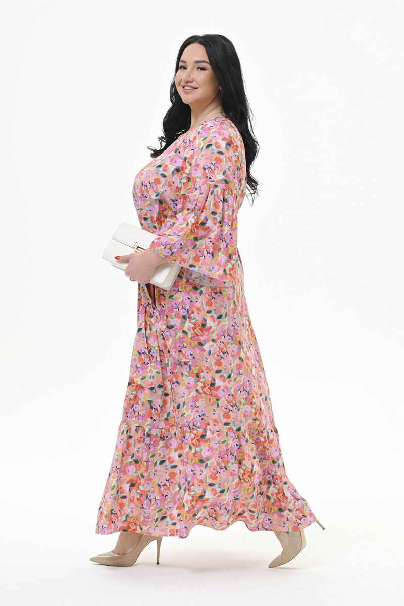 Мультиколор Длинное платье свободного силуэта из штапеля. По горловине переда V - вырез. По низу платья присборенный волан  Рукав втачной, свободный,
