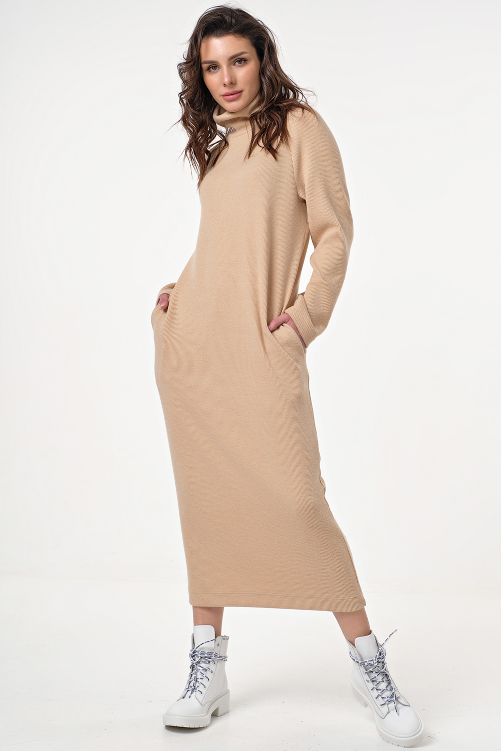 • Особенности: Платье прямого силуэта из фактурного трикотажа в рубчик. Детали: воротник - мягкая стойка, длинный рукав - реглан, карманы в боковых швах.