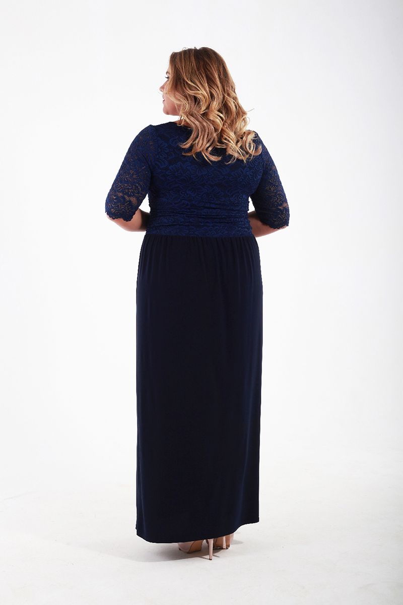 Темно-синий Утонченное длинное вечернее платье из французского кружева. Внутренняя часть верха и юбка выполнены из трикотажа в тон. В области талии драппировка из кружева, скрывающая животик, если это необходимо.